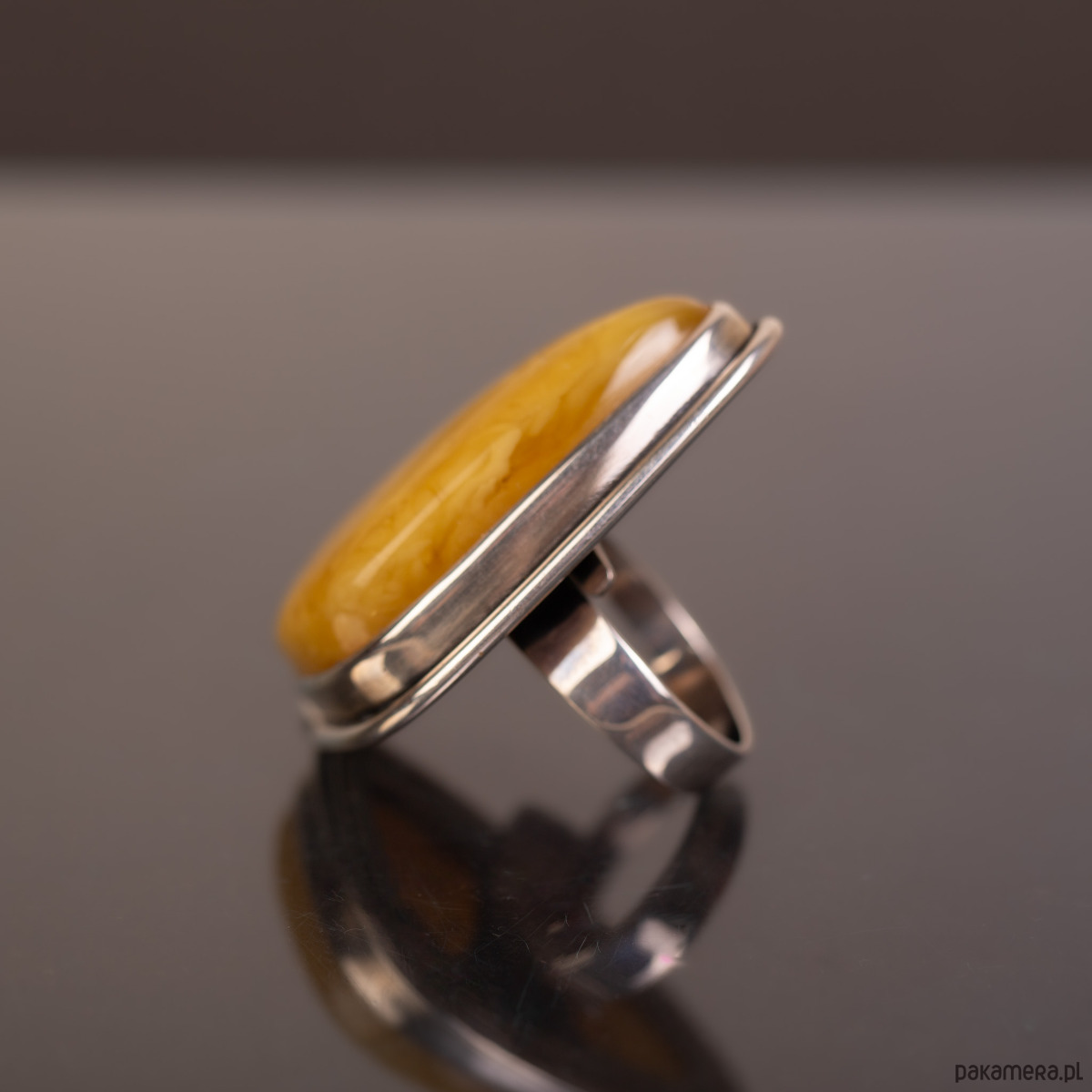 Oprawa ma wymiary 4,5 × 2,4 cm, a wysokość zaledwie 1 cm, co sprawia, że pierścionek jest bardzo elegancki i dobrze przylega do dłoni. Duża powierzchnia bursztynu jest wyraźnie widoczna i przyciąga spojrzenia.