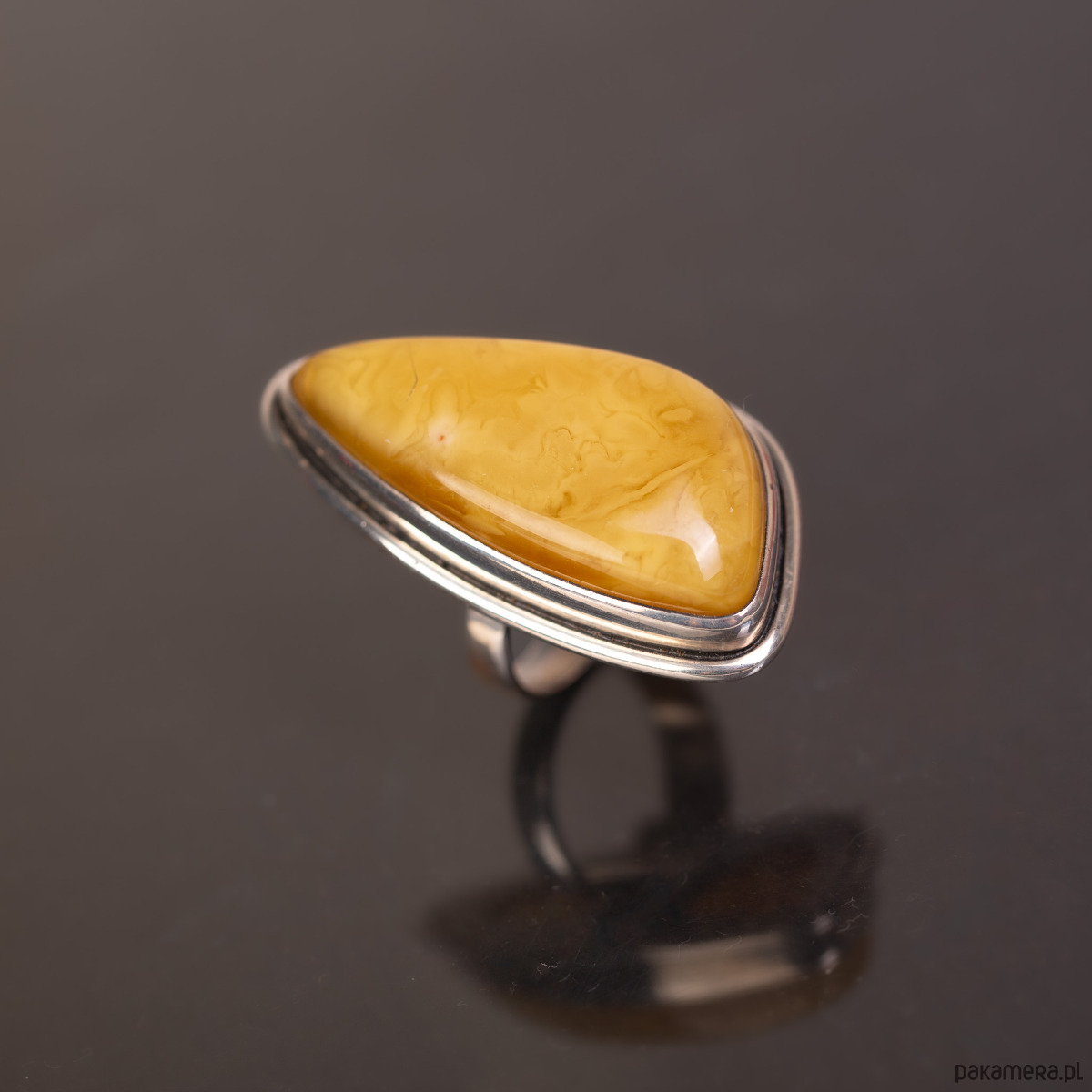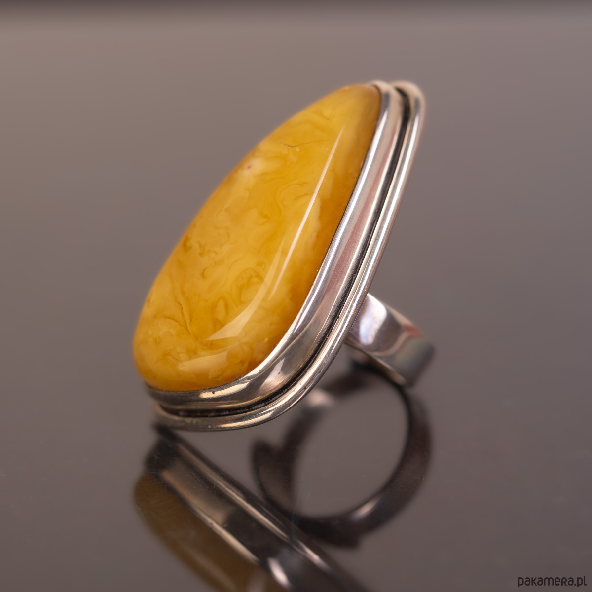 Spektakularny pierścionek z naturalnym bursztynem bałtyckim w ciepłym, miodowym odcieniu. Duża, gładko polerowana bryła bursztynu ma głębokie, żywe światło i piękną strukturę. Ręcznie formowana srebrna oprawa z delikatnymi liniami podkreśla organiczny kształt bursztynu, tworząc biżuterię o luksusowym, nowoczesnym charakterze. To jeden, dominujący akcent, który mówi sam za siebie.