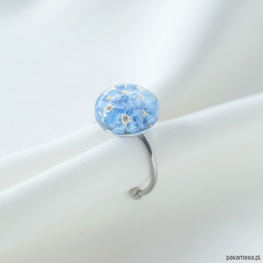 Pierścionek wykonany jest z żywicy epoksydowej z wykorzystaniem suszonych kwiatów. Metalowe elementy to stal nierdzewna szlachetna chirurgiczna.