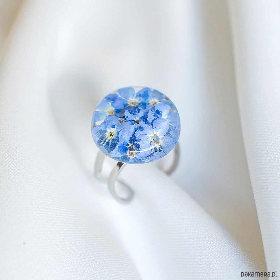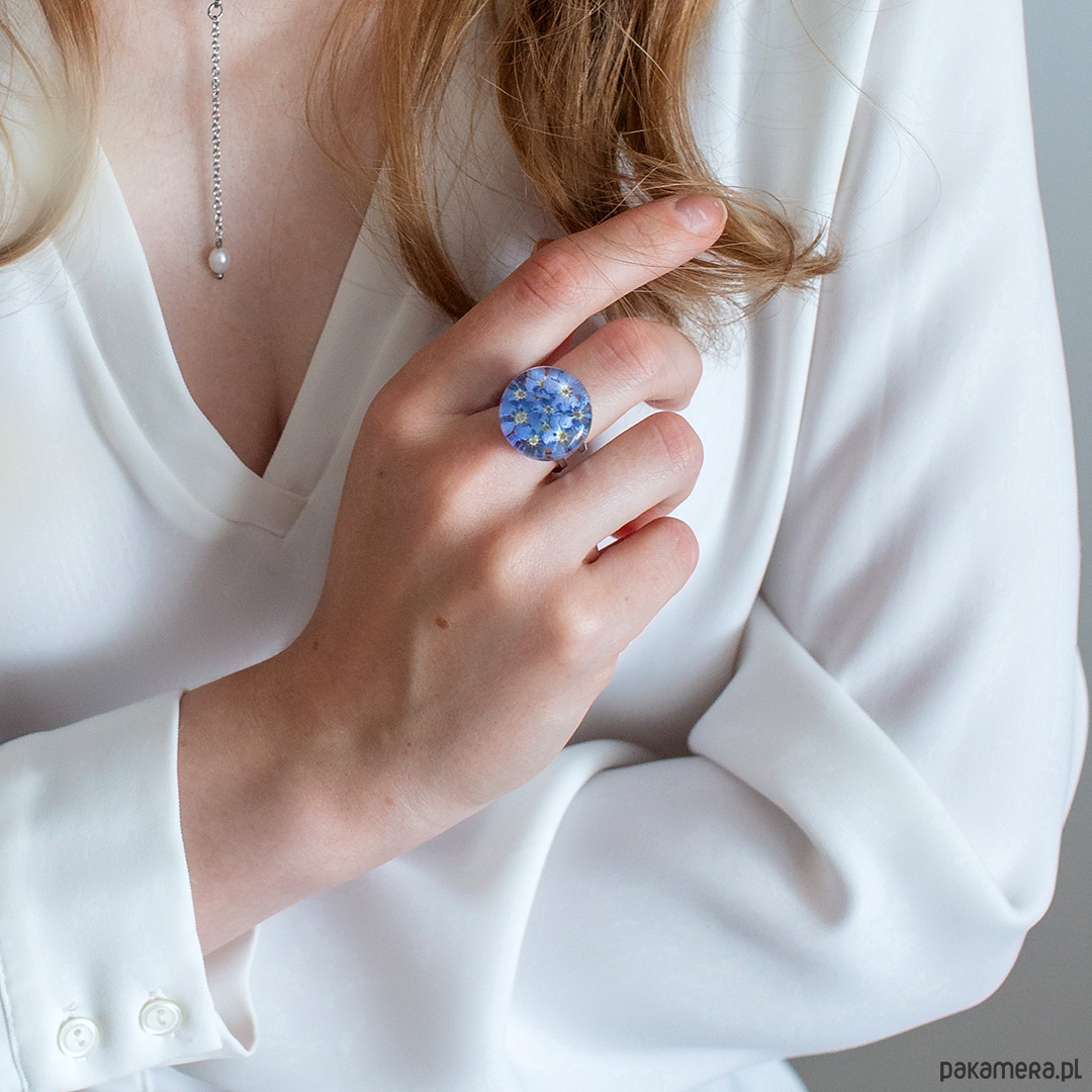 Pierścionek wykonany jest z żywicy epoksydowej z wykorzystaniem suszonych kwiatów. Metalowe elementy to stal nierdzewna szlachetna chirurgiczna.