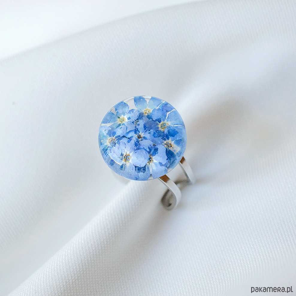 Pierścionek wykonany jest z żywicy epoksydowej z wykorzystaniem suszonych kwiatów. Metalowe elementy to stal nierdzewna szlachetna chirurgiczna.