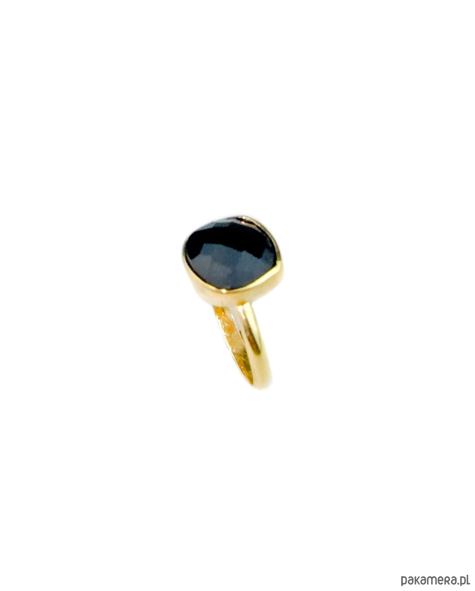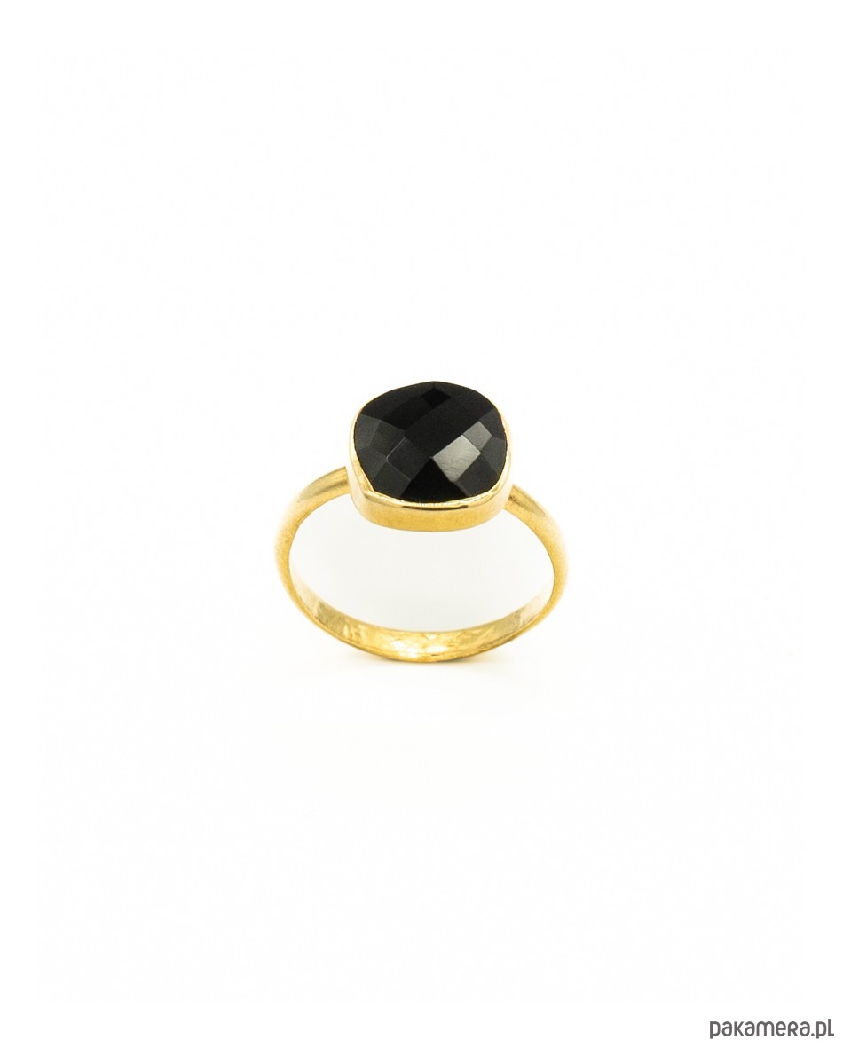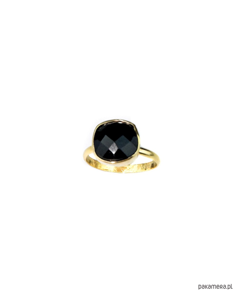 Pierścionek z dużym, fasetowanym onyksem w klasycznej oprawie, wykonany ręcznie ze srebra próby 925, złocony 24 k złotem.