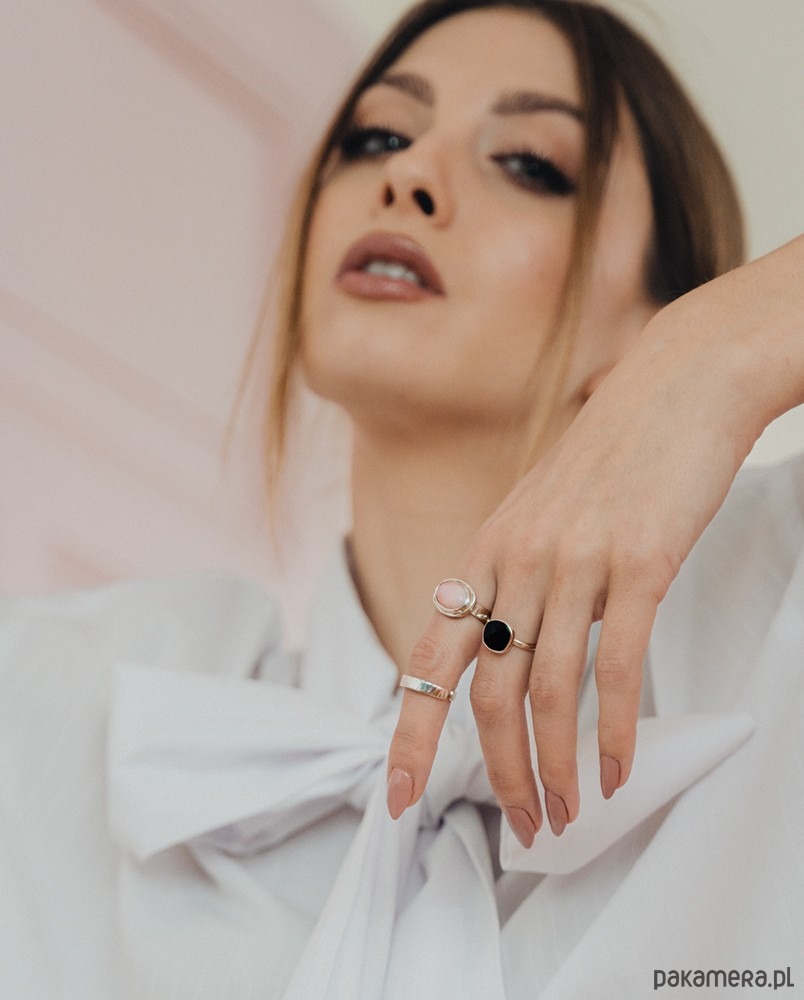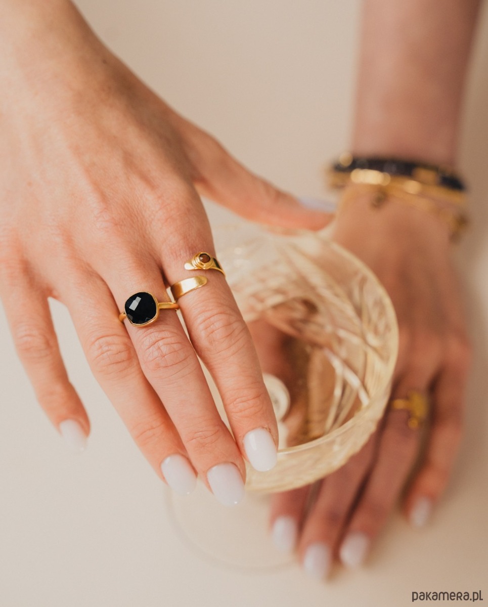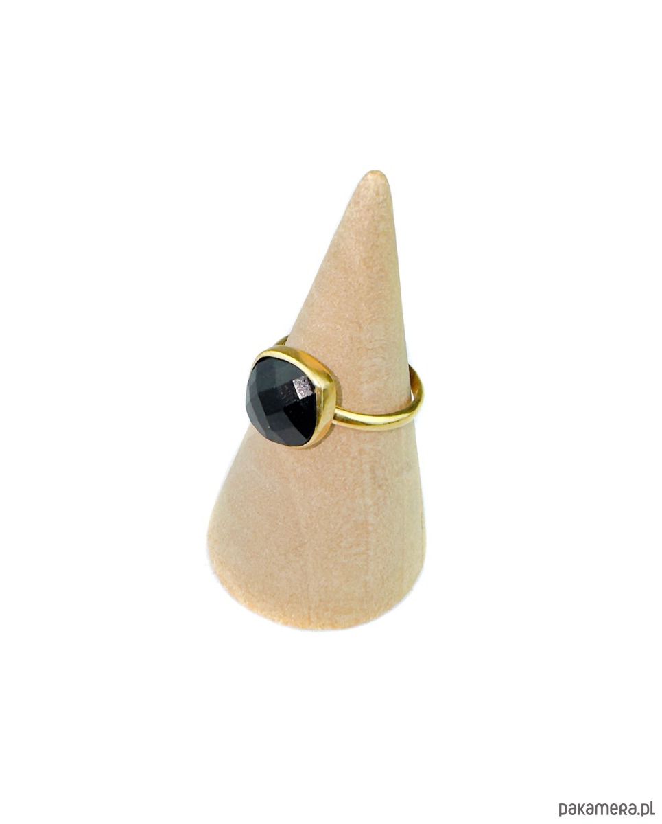 Pierścionek z dużym, fasetowanym onyksem w klasycznej oprawie, wykonany ręcznie ze srebra próby 925, złocony 24 k złotem.