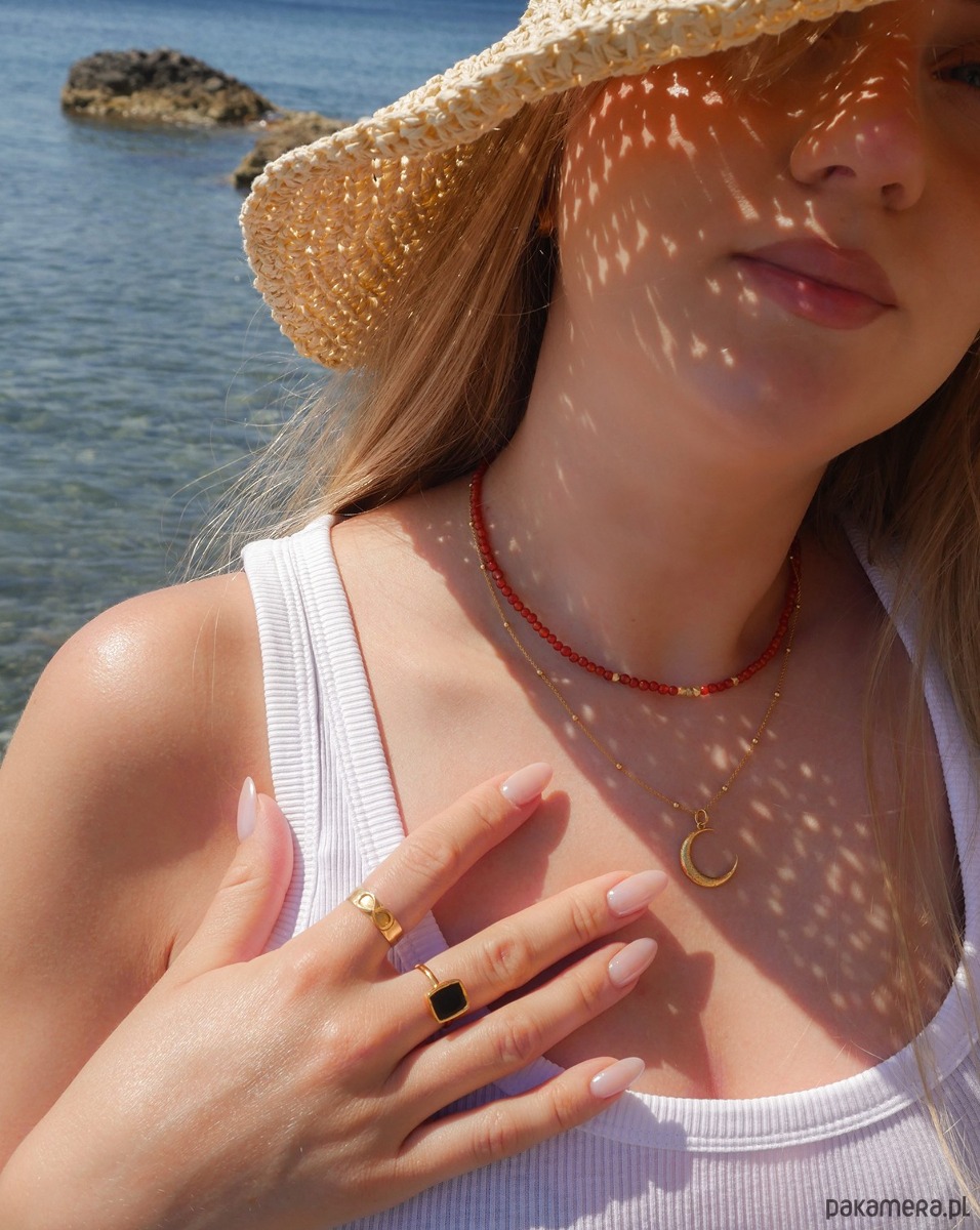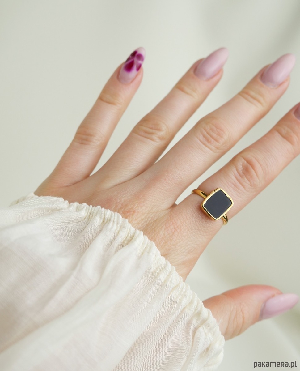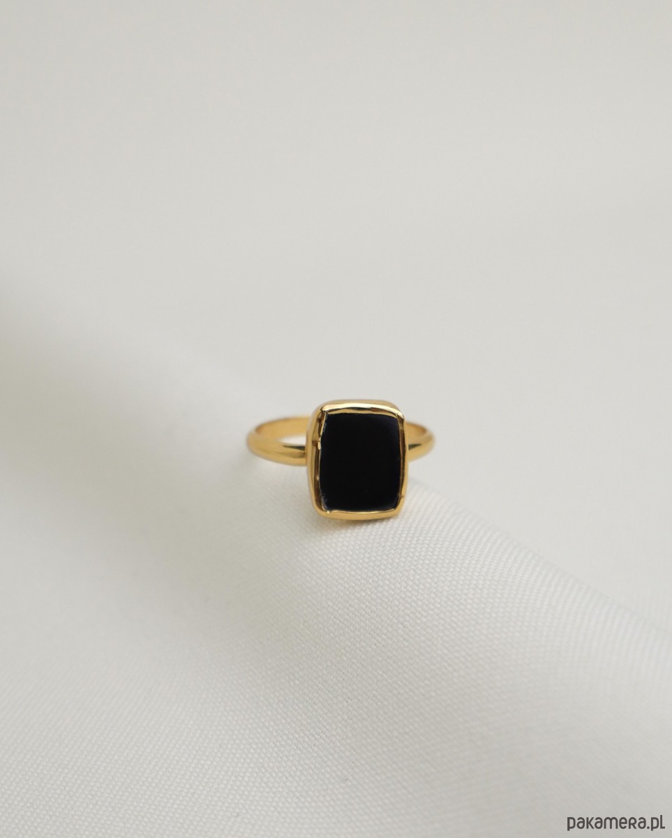 Pierścionek z dużym, gładkim onyksem w klasycznej oprawie, wykonany ręcznie ze srebra próby 925. Dostępny na zamówienie w wersji srebrnej lub złocony 24 k złotem.