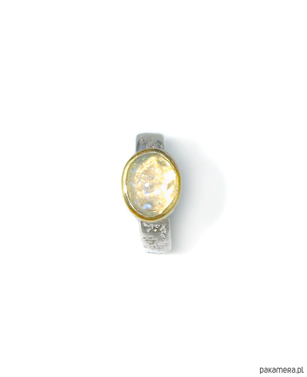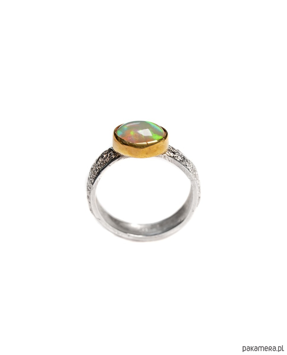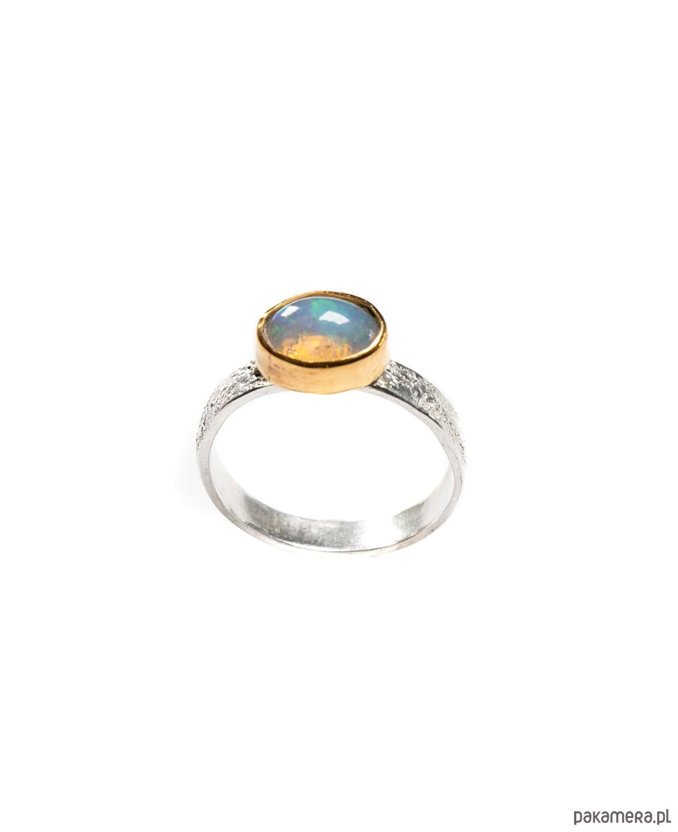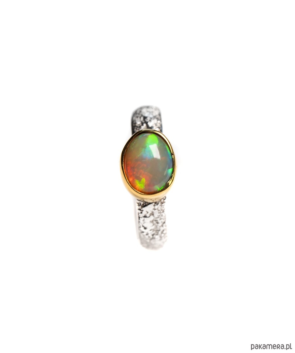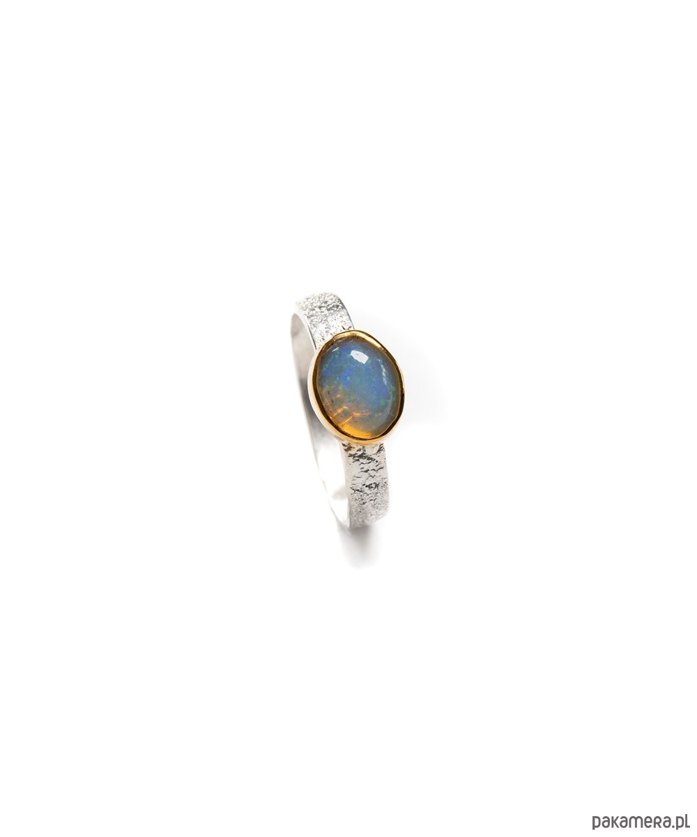 Pierścionek wykonany od podstaw ręcznie. Opal naturalny, został osadzony w złoconej oprawie na szerokiej, lekko pękatej obrączce o fakturowanej powierzchni. Srebro pr. 925. Oprawa złocona 24k złotem.