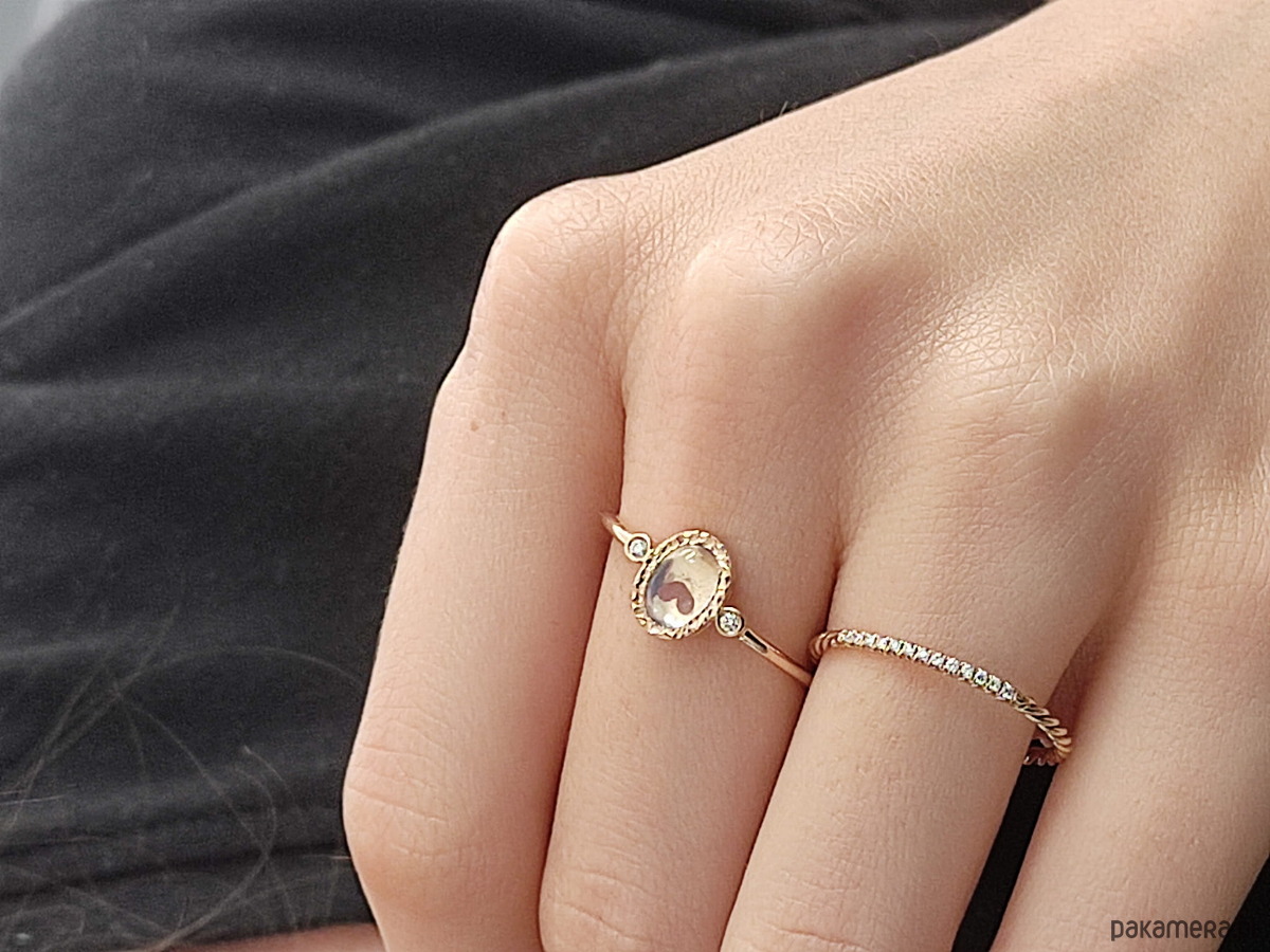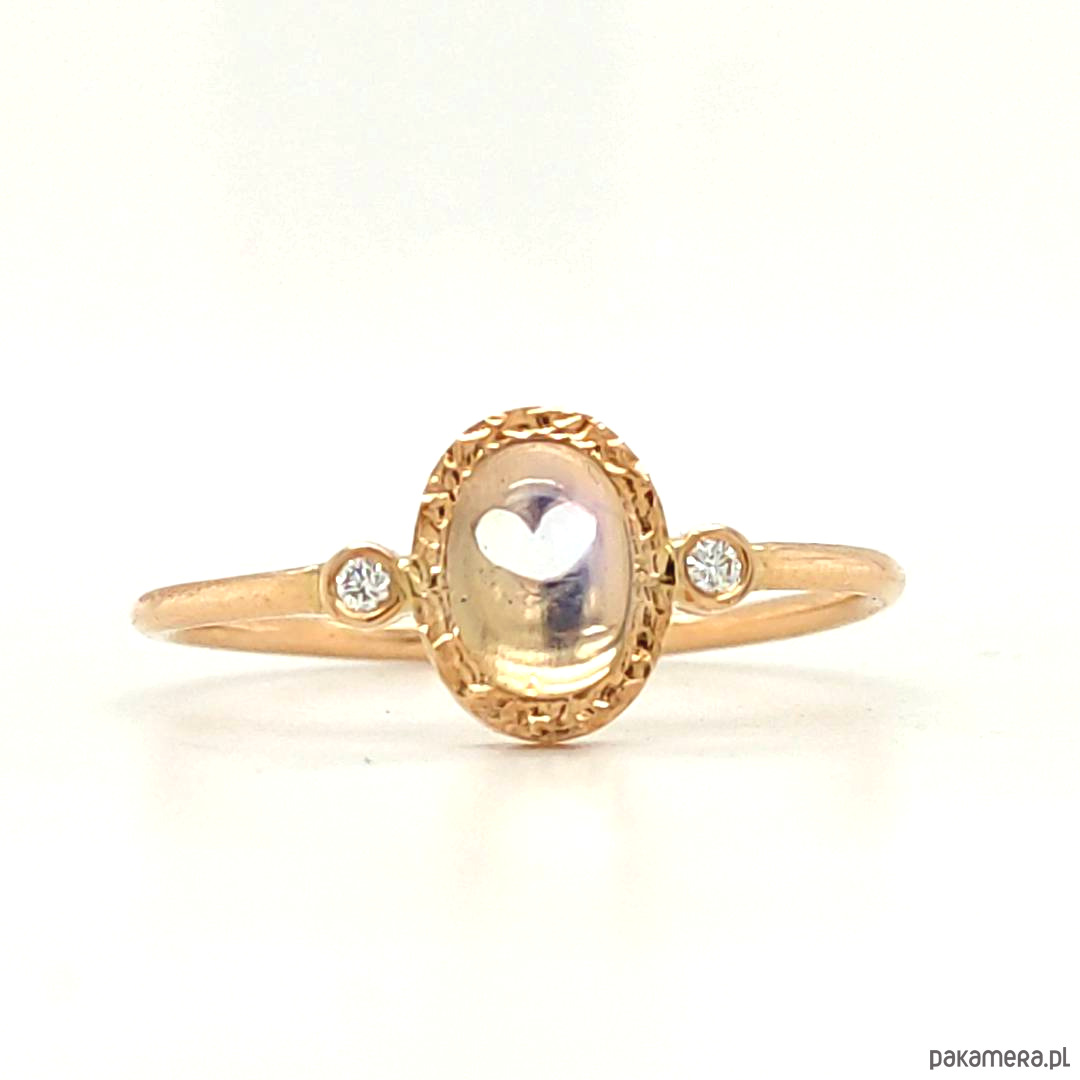 Ten elegancki pierścionek z naturalnym kamieniem księżycowym łączy w sobie klasykę, subtelność i odrobinę magii. Owalny kamień księżycowy o poświacie pełnej tajemniczości, osadzony w oprawie bezel, łączy ochronę z ponadczasowym szykiem. Drobne diamenty po bokach dodają blasku, a wycięte z tyłu serduszko symbolizuje miłość i czułość.