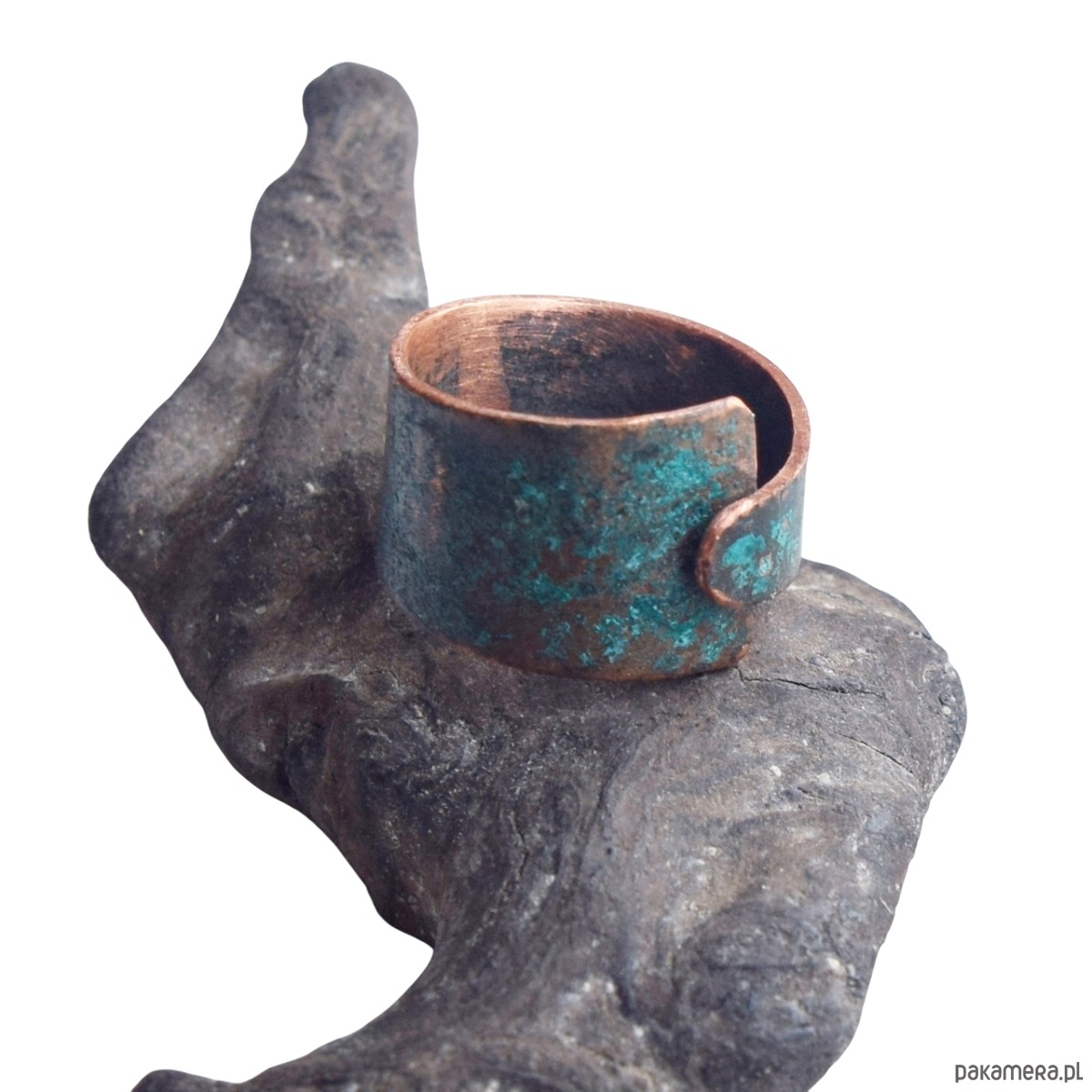 Pierścionek wykonany z patynowanej miedzi (naturalna zielona patyna). Średnica ok. 20 mm. Szerokość od 5-15 mm.