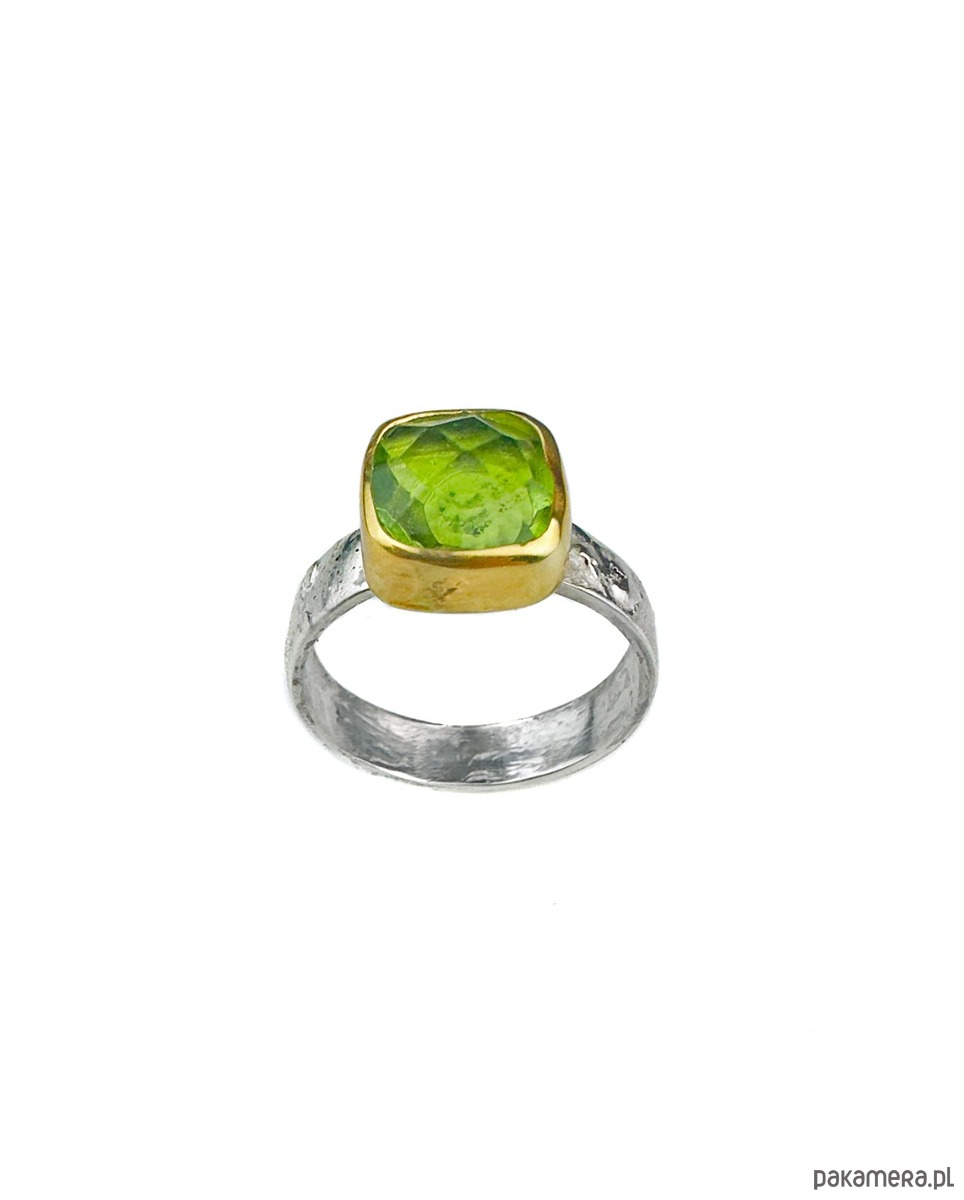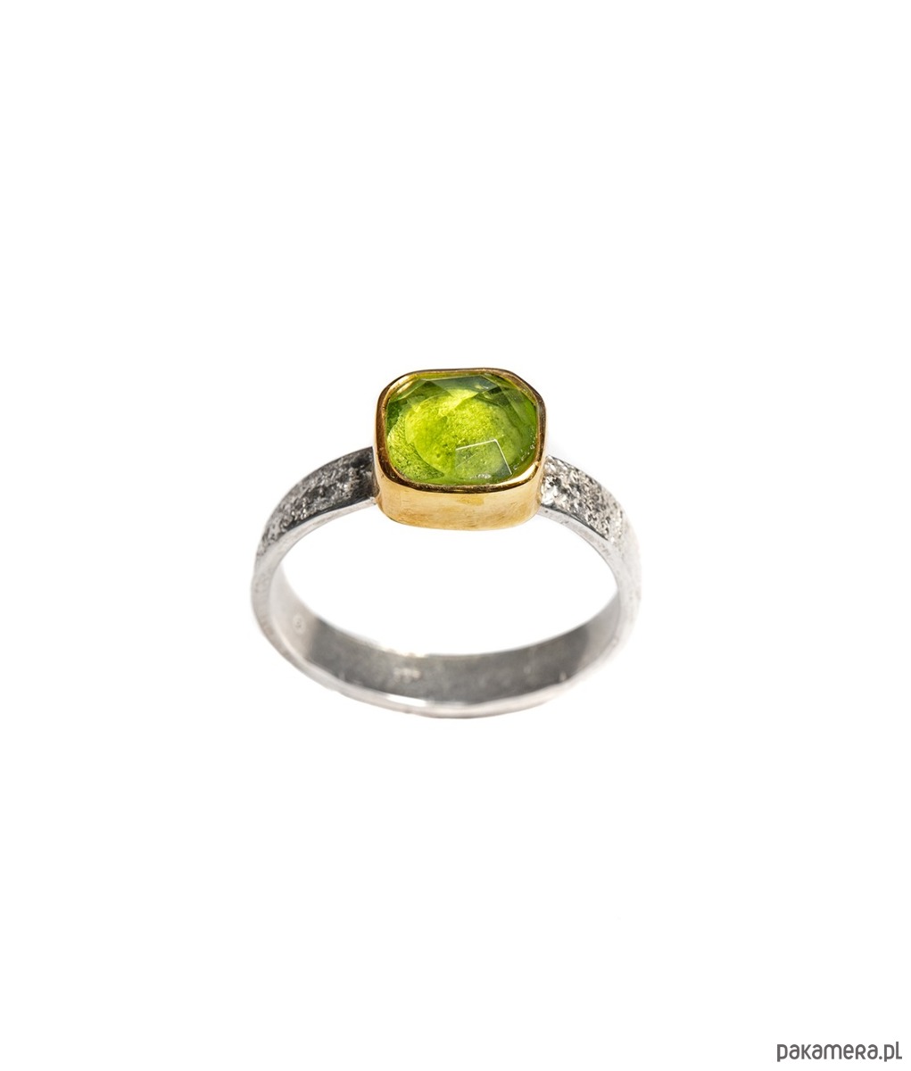 Pierścionek wykonany ręcznie. Fasetowany peridot naturalny, został osadzony w złoconej oprawie na szerokiej, lekko pękatej obrączce o fakturowanej powierzchni. Srebro pr. 925. Oprawa złocona 24k złotem.