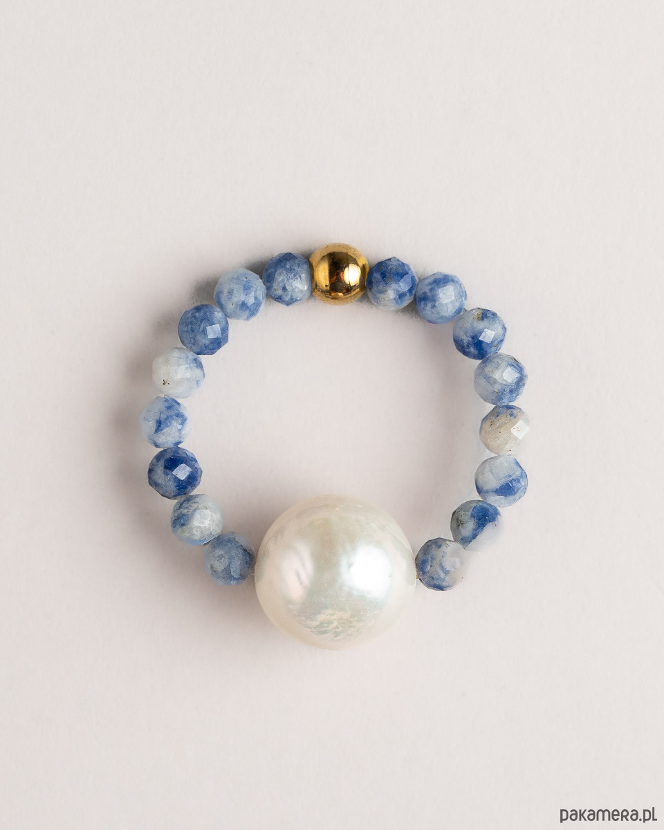 Przepiękny pierścionek z dużą perłà. Wykonany ręcznie z naturalnego sodalitu.
