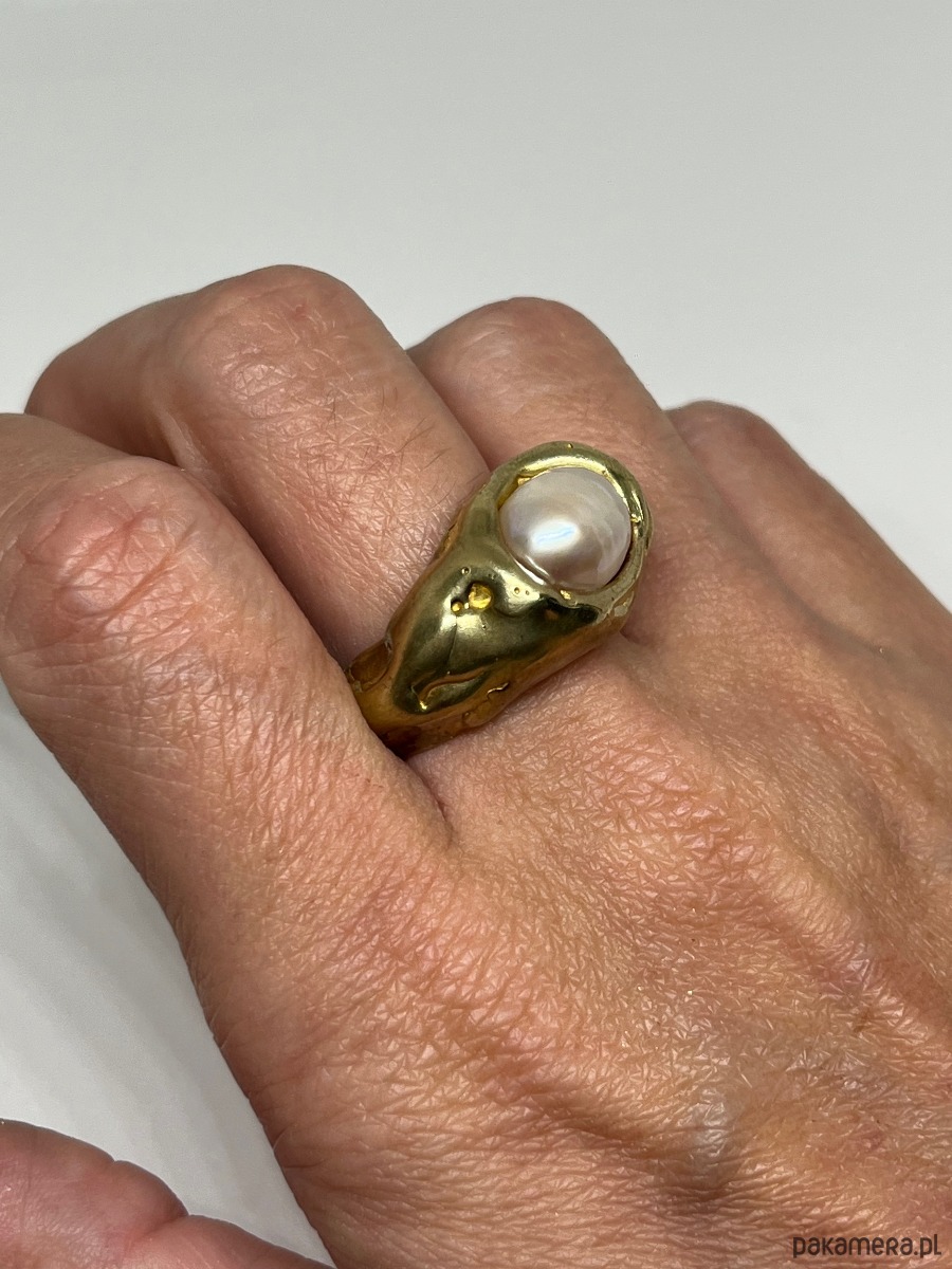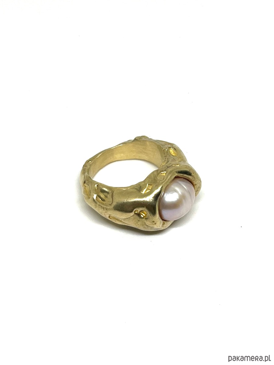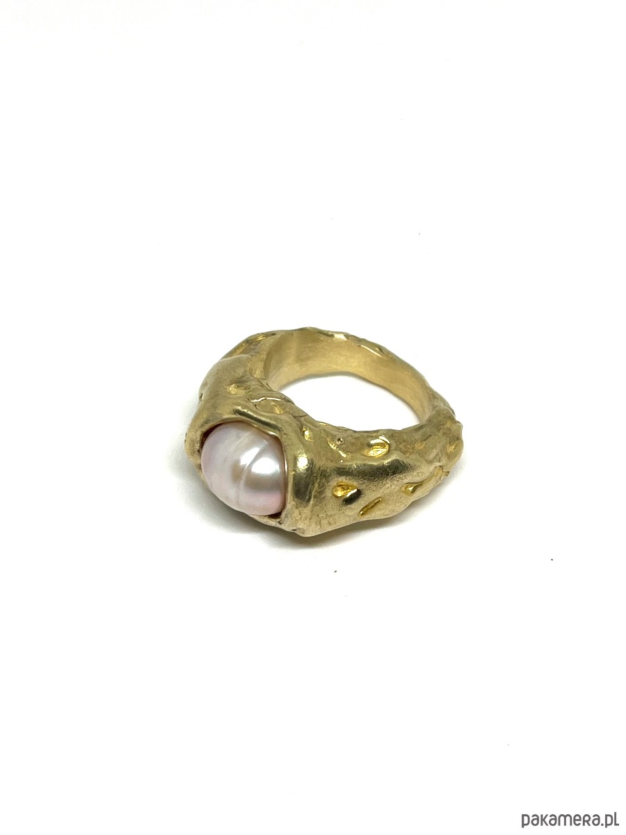 Pierścionek z mosiądzu o abstrakcyjnej, ręcznie opracowanej teksturze. W jego centrum spoczywa perła słodkowodna — delikatna, naturalna, niepowtarzalna. Surowość metalu i miękkość perły tworzą razem harmonię. Technika: Ręczna metoda traconego wosku. Rozmiar 52/12. Biżuteria stworzona dla tych, którzy cenią piękno w jego najprostszej postaci.