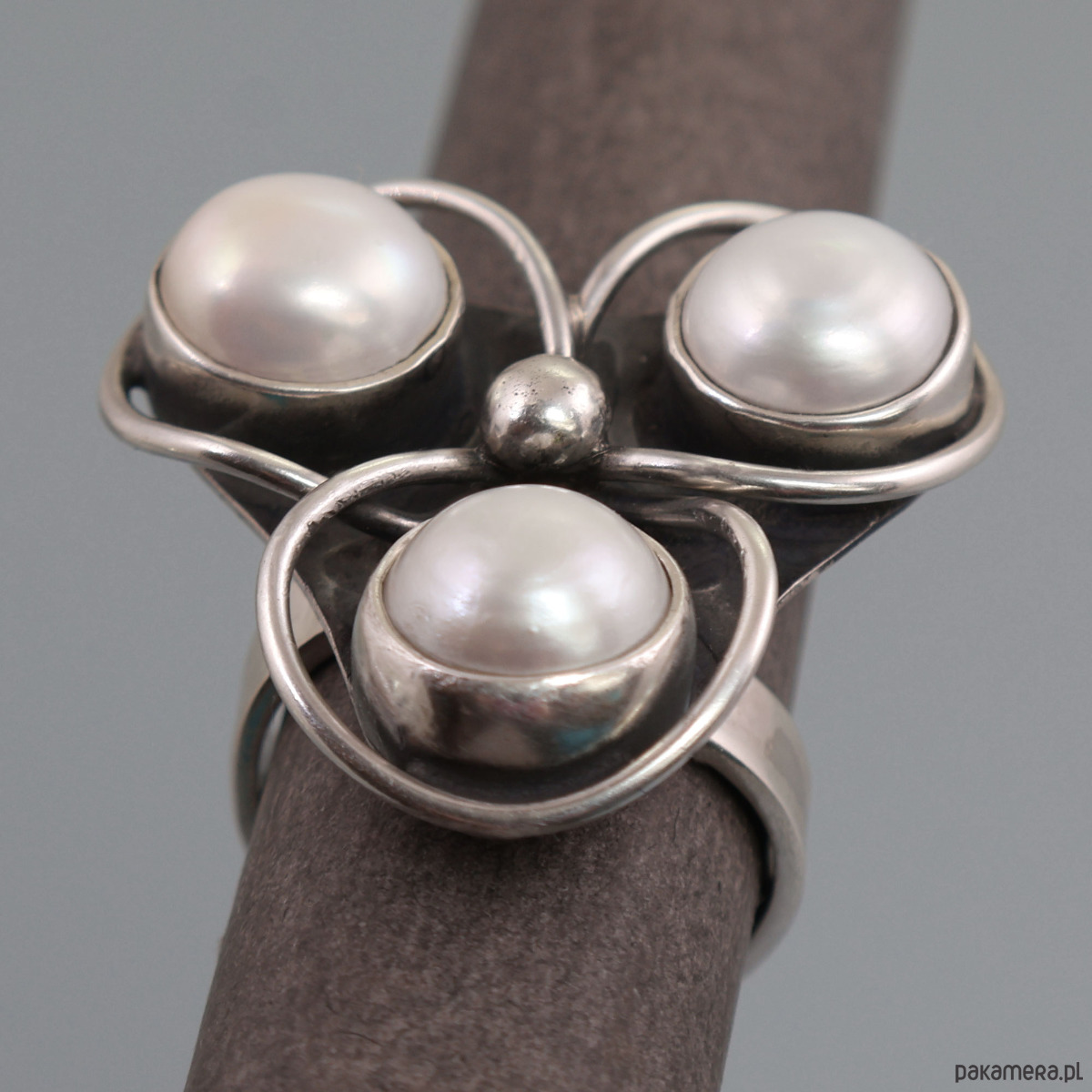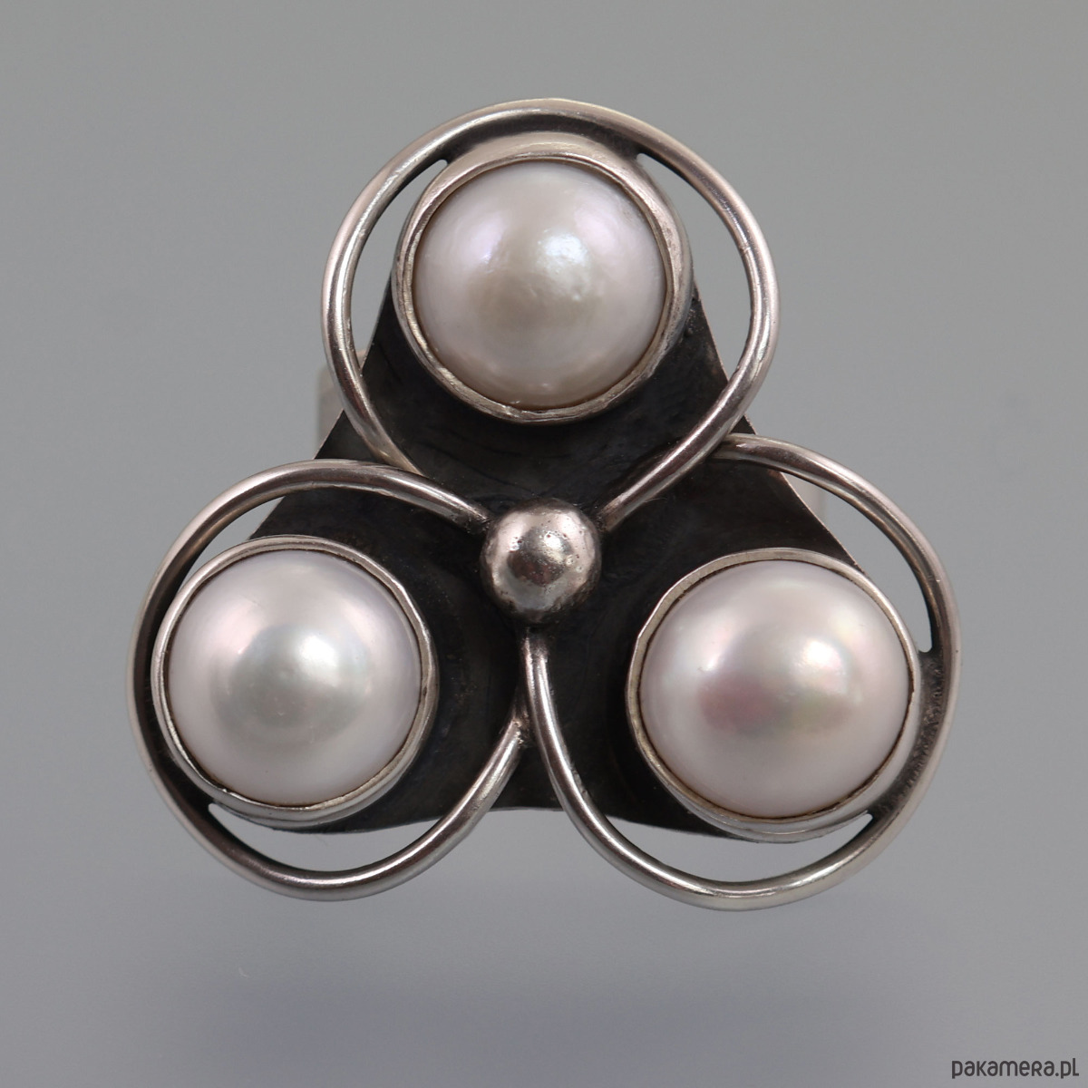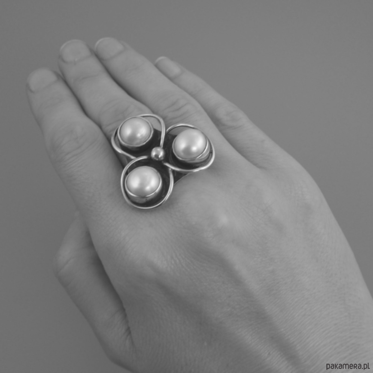 Ręcznie wykonany srebrny pierścionek z perłami. Wymiary korony pierścionka: 3,15 cm x 3,2 cm, średnica perły: 1,0 cm. Srebro próby 925 - próba wybita na spodzie obrączki. Rozmiar obrączki: regulowany. Regulacja pod oczkiem - niewidoczna podczas noszenia pierścionka. Rozmiar wyjściowy: 17 (średnica wewnętrzna 1,8 cm); Waga pierścionka: 14,9 g.