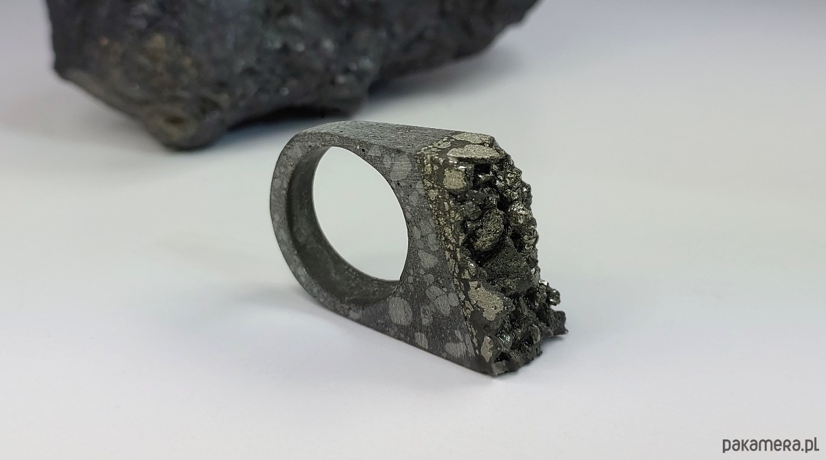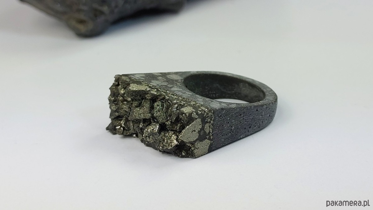 Unikatowy, betonowy pierścionek wykończony pirytem w rozmiarze 17.