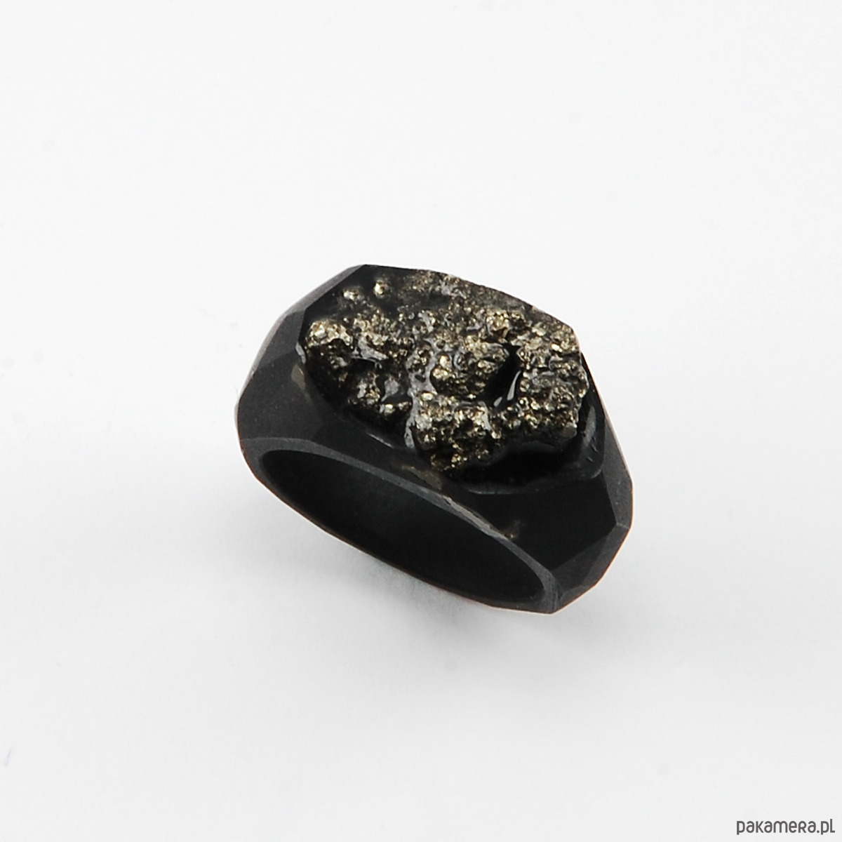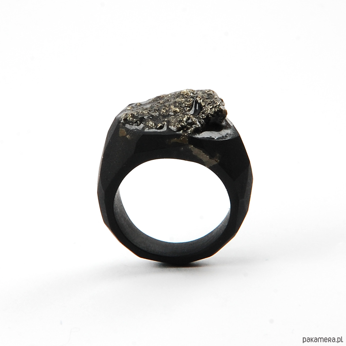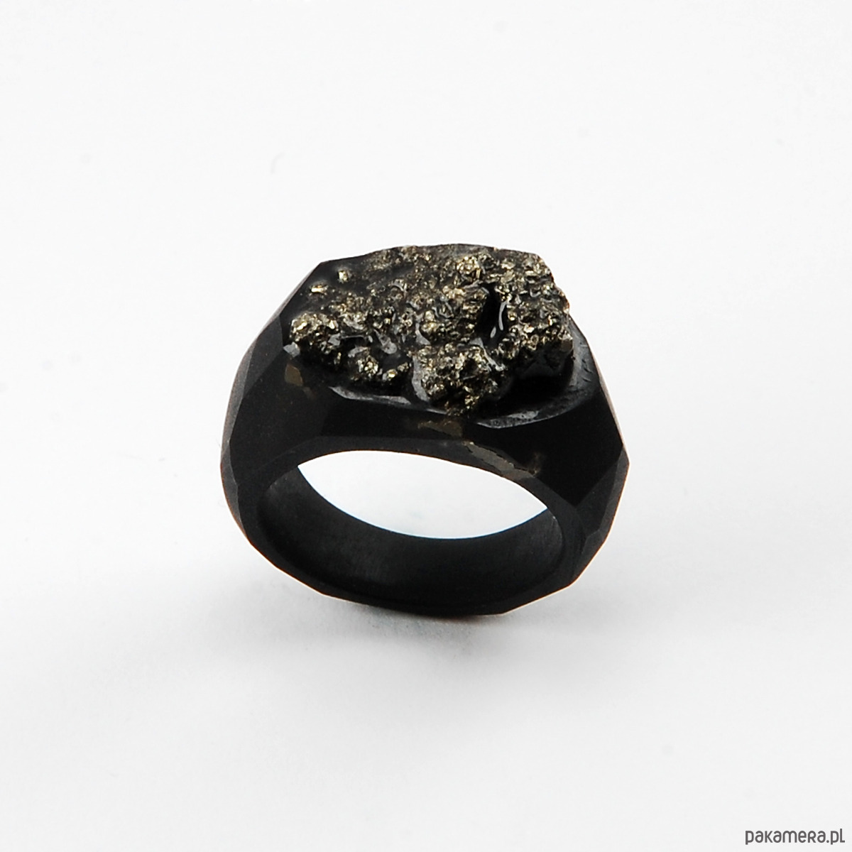 Pierścionek z naturalnym kamieniem- pirytem. Kamień został oprawiony w czarną żywicę jubilerską.