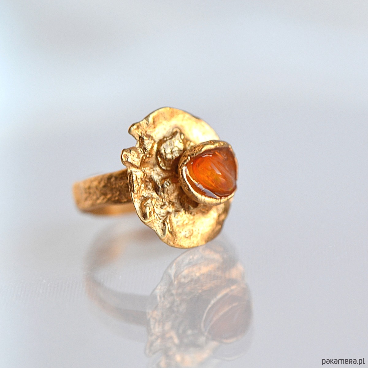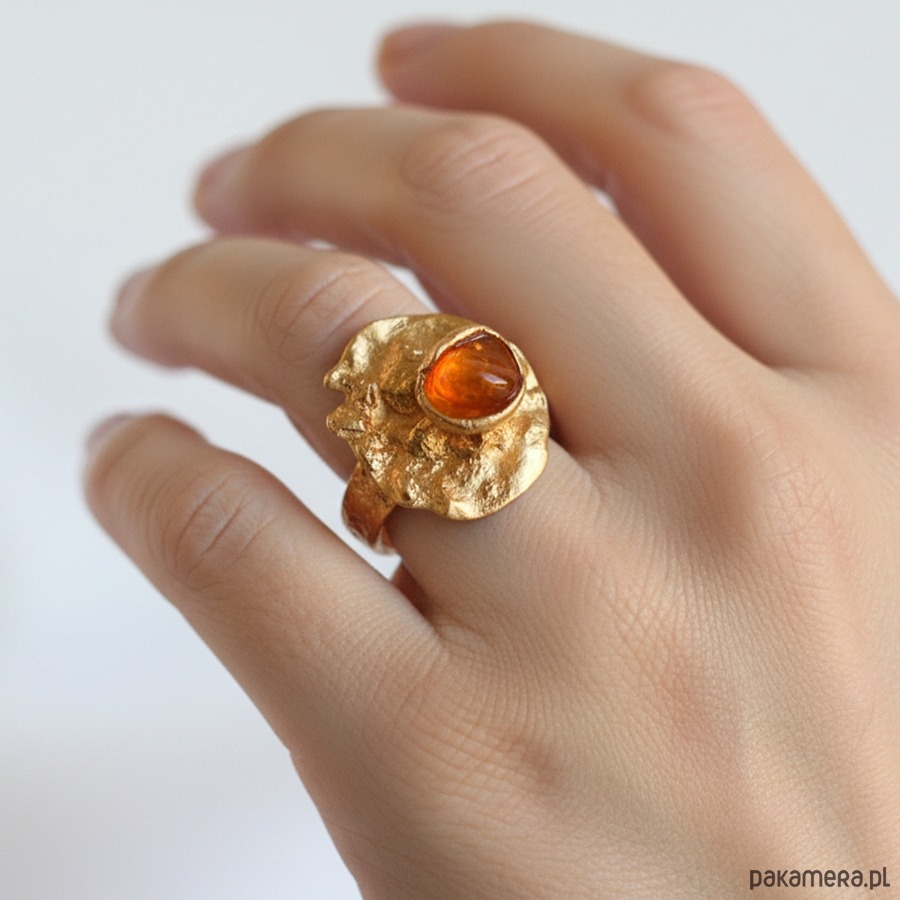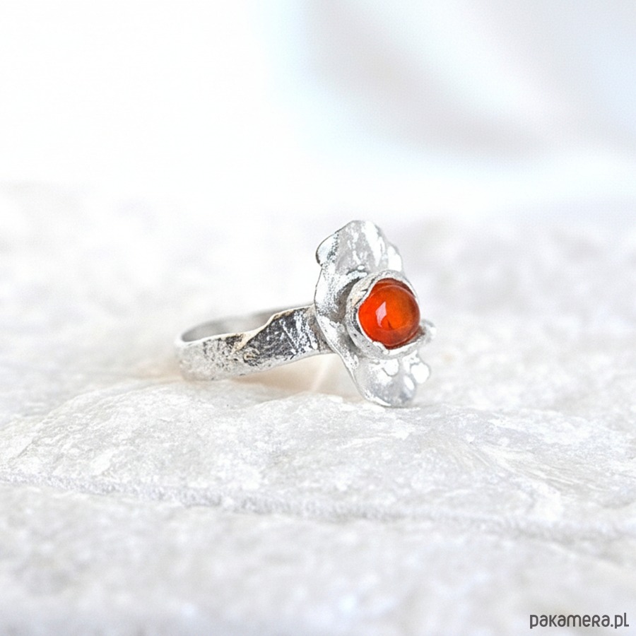 Pierścionek z pomarańczowym karneolem w organicznym kształcie.