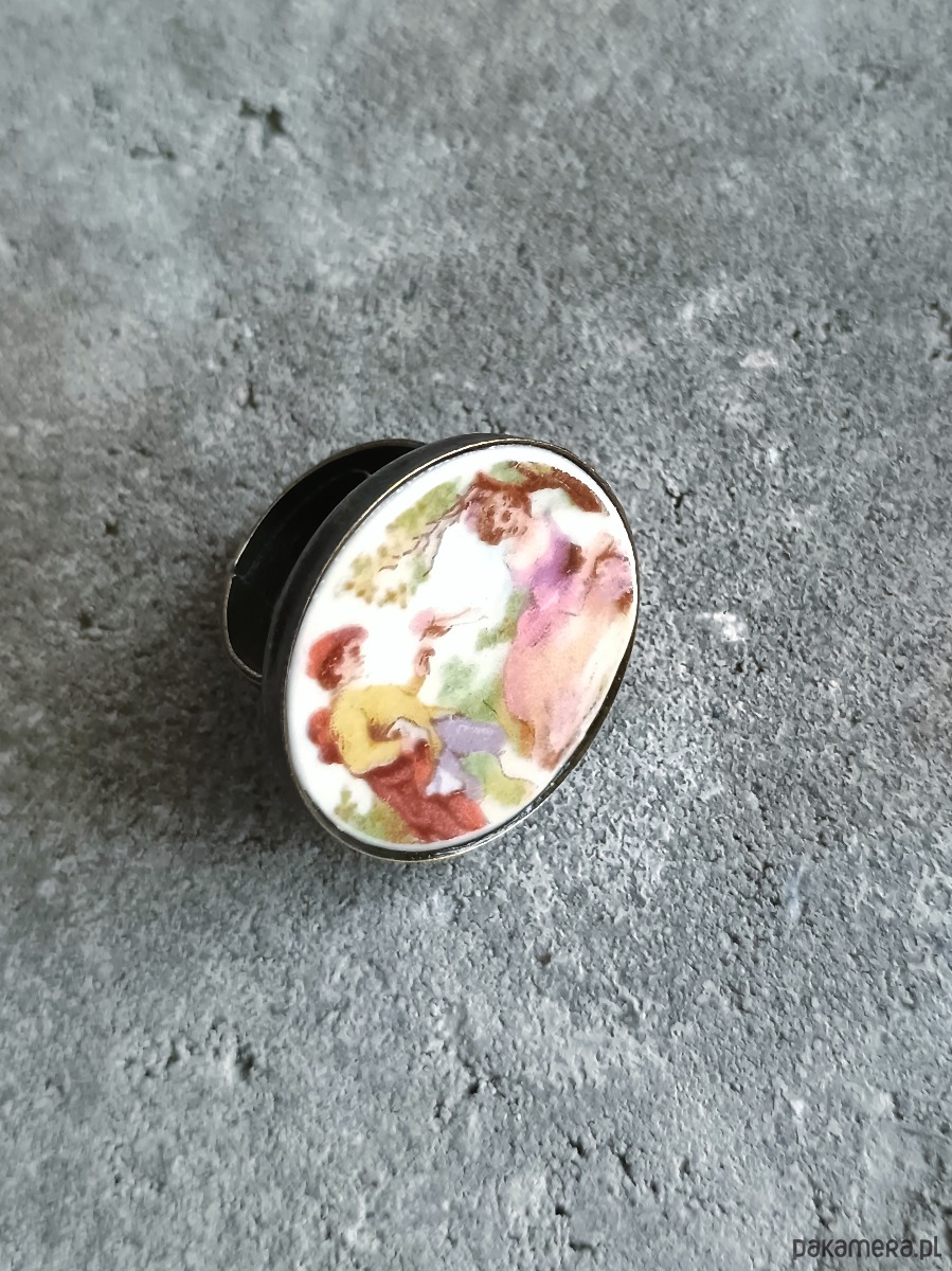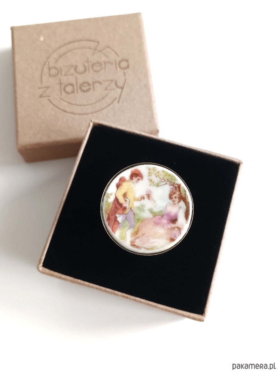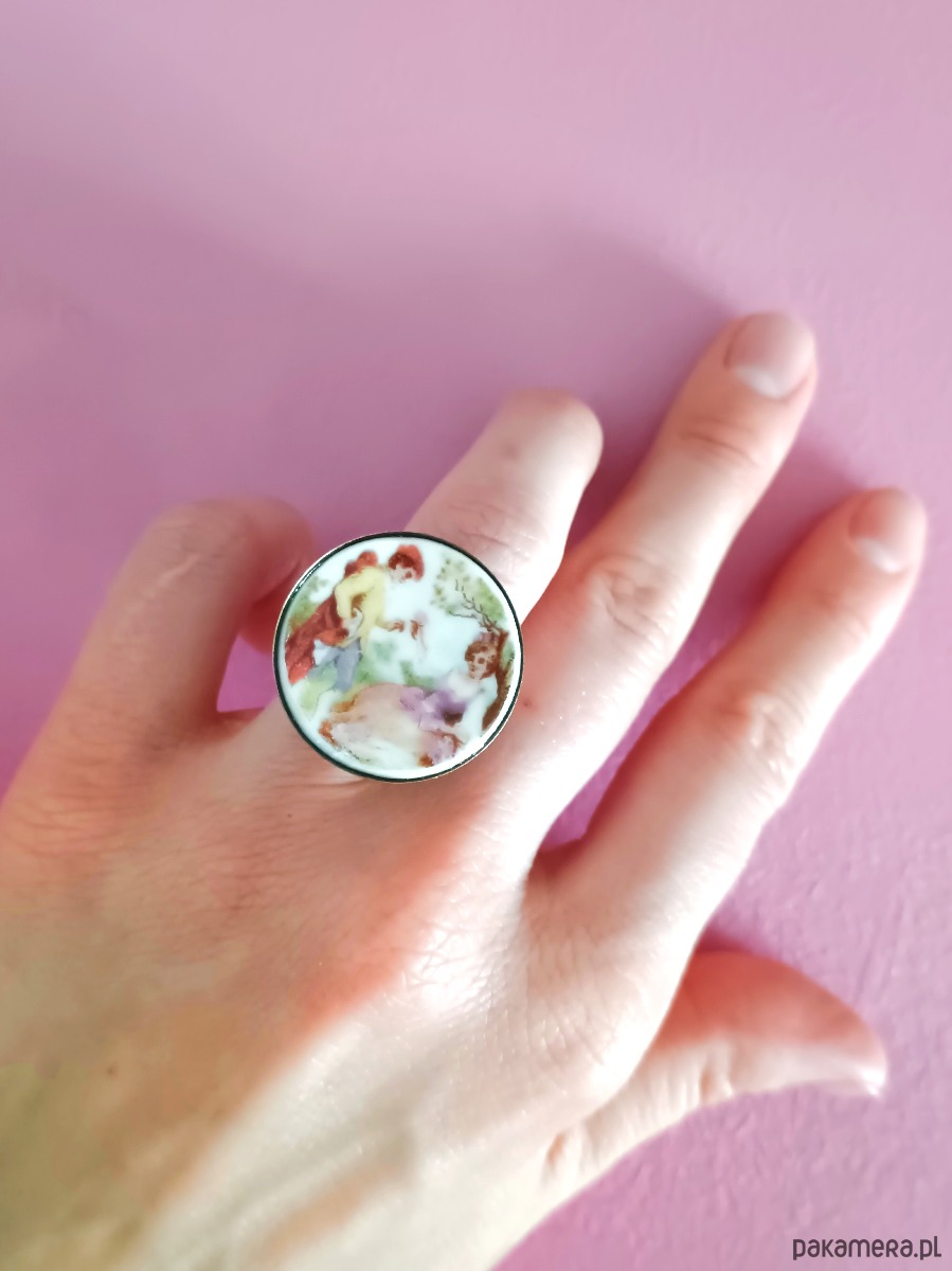Oto pierścionek, który wykonałam z fragmentu stłuczonego talerza z motywem zakochanej pary. Kawałek stłuczki oszlifowałam w okrągły kształt i połączyłam z metalową bazą w kolorze mosiądzu. Baza jest regulowana - będzie pasowała na każdy rozmiar. Ceramikę zeszlifowałam również z grubości - jest cieńsza niż pierwotnie, dzięki czemu pierścionek nie jest ciężki. Brzegi pokryłam lakierem, co sprawia, że nie brudzą się i nie chłoną wilgoci. Średnica elementu ceramicznego: 26 mm. Unikat - każdy z moich wyrobów występuje w jednym egzemplarzu. Upcykling - nie reprodukuję wykorzystywanych wzorów, niczego nie domalowuję - wykorzystuję wyłącznie oryginalne naczynia i motywy, które się na nich znajdują. Tym samym, stłuczce z odzysku nadaję nowe życie.