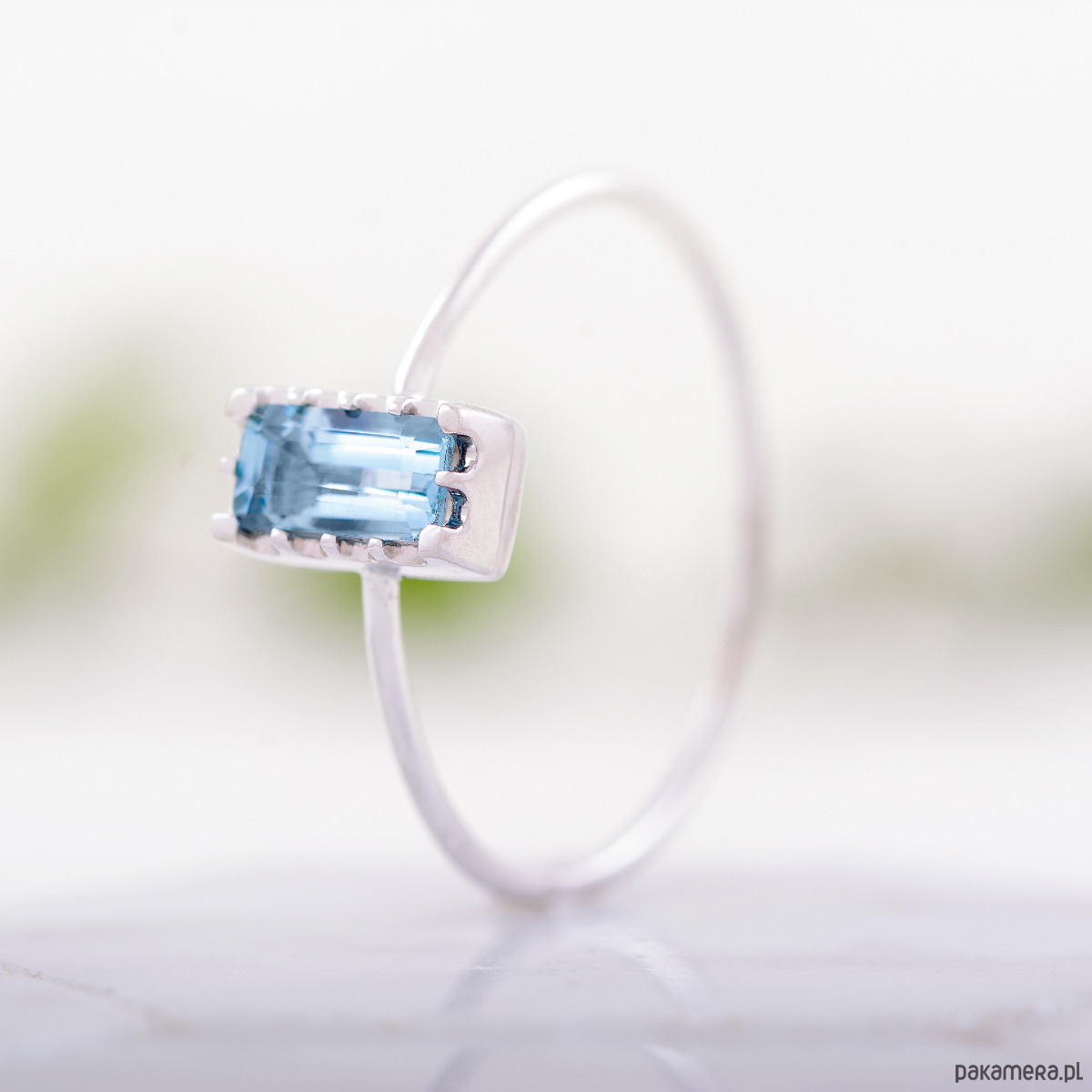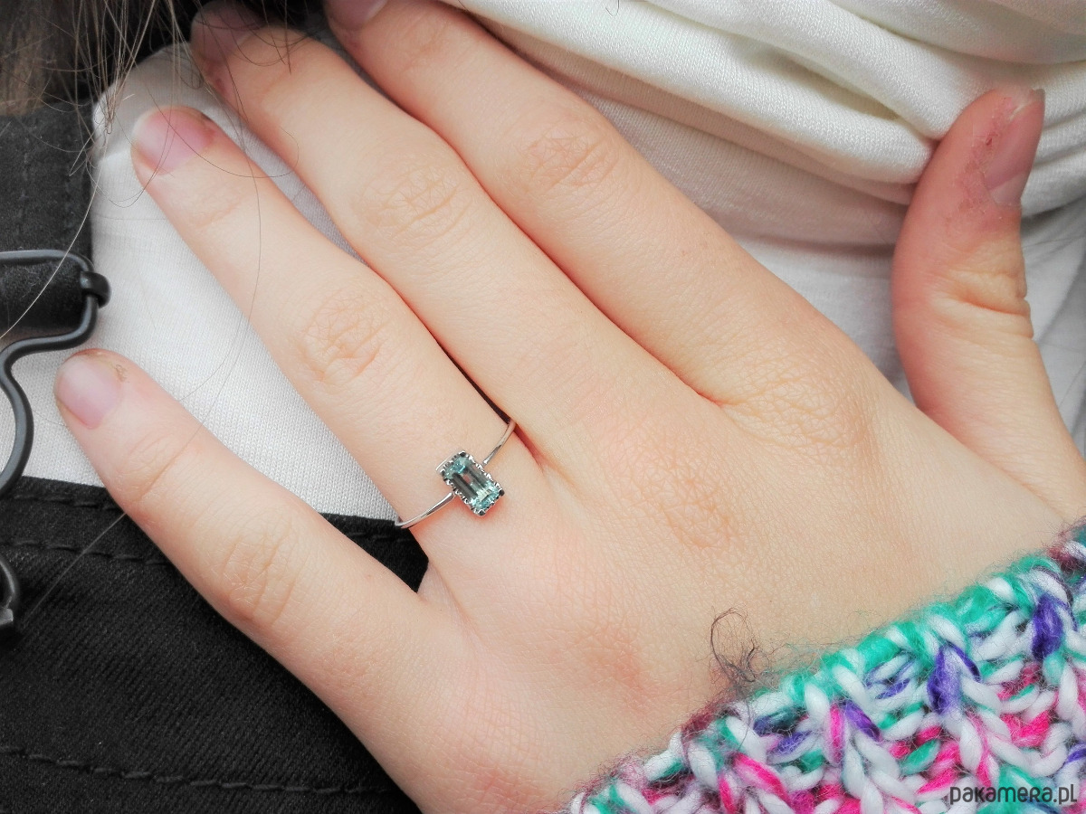 Subtelny i pełen uroku, ten pierścionek z naturalnym akwamarynem został wykonany ręcznie w białym złocie próby 585. Prostokątny niebieski kamień, oprawiony w delikatne łapki, emanuje naturalnym blaskiem i podkreśla minimalistyczny, a jednocześnie elegancki charakter biżuterii.