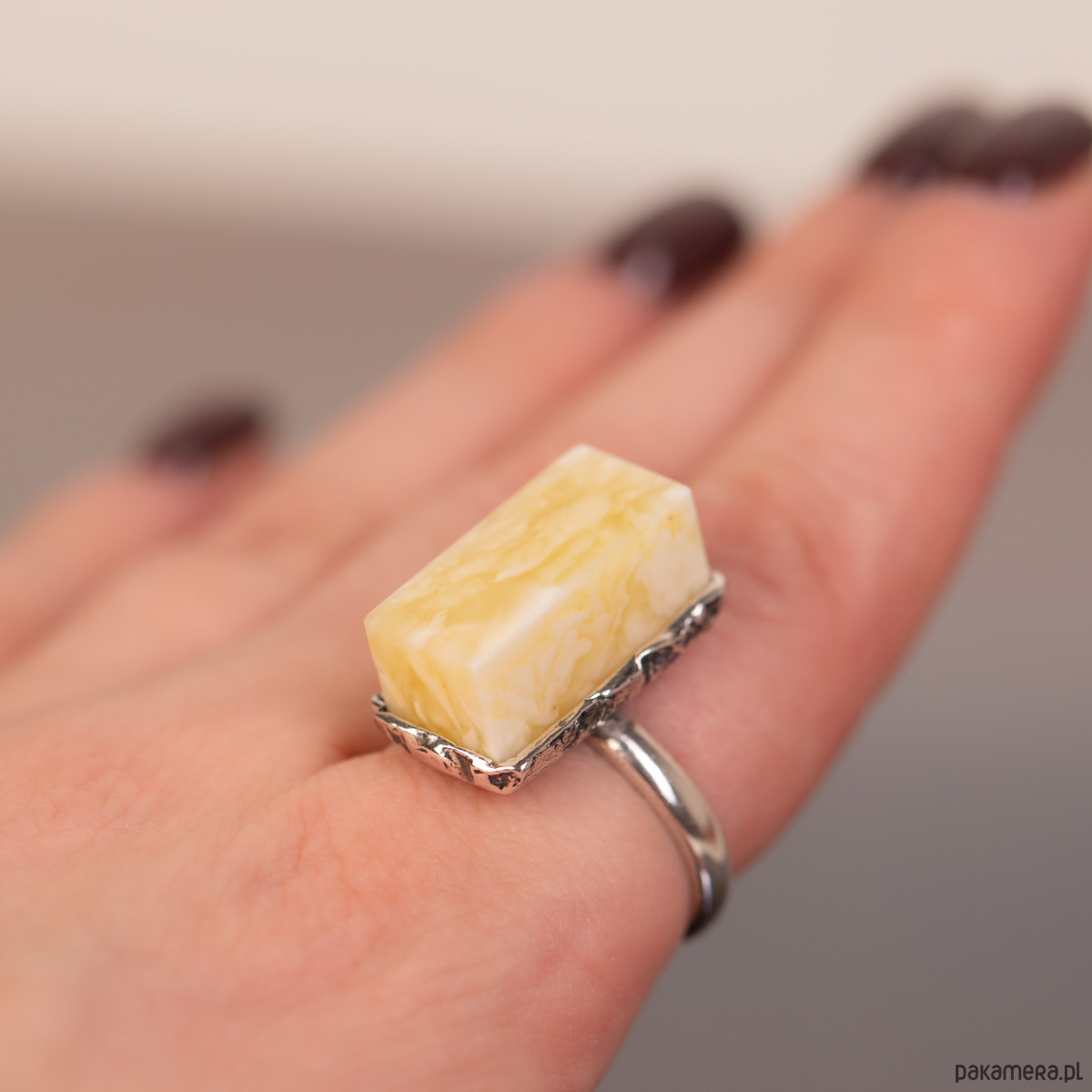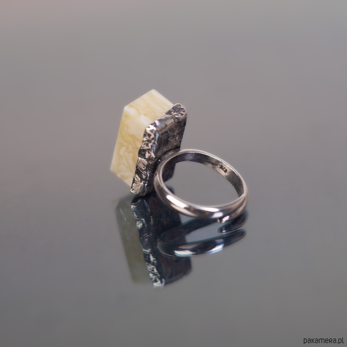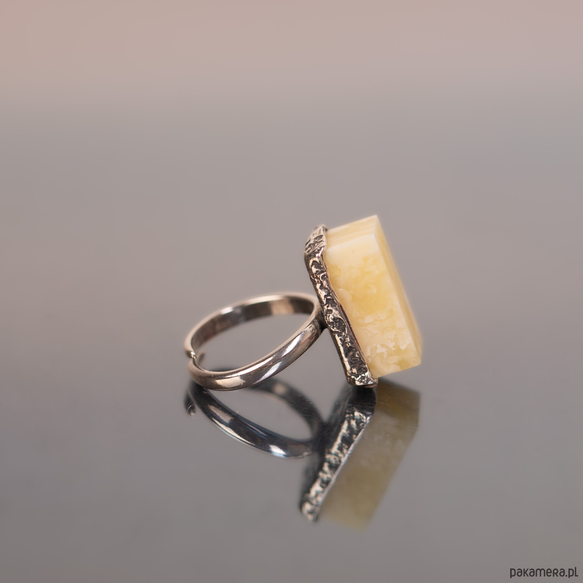 Srebro próby 925 · naturalny bursztyn bałtycki (mleczny) · waga 7 g · bursztyn 2 × 1 cm · oprawa 1,2 × 2,2 cm · wysokość 1 cm · obrączka regulowana EU 9–20 · wykonanie ręczne, praca autorska