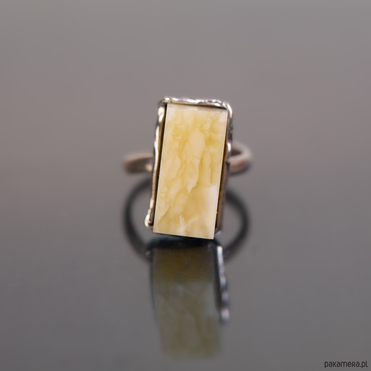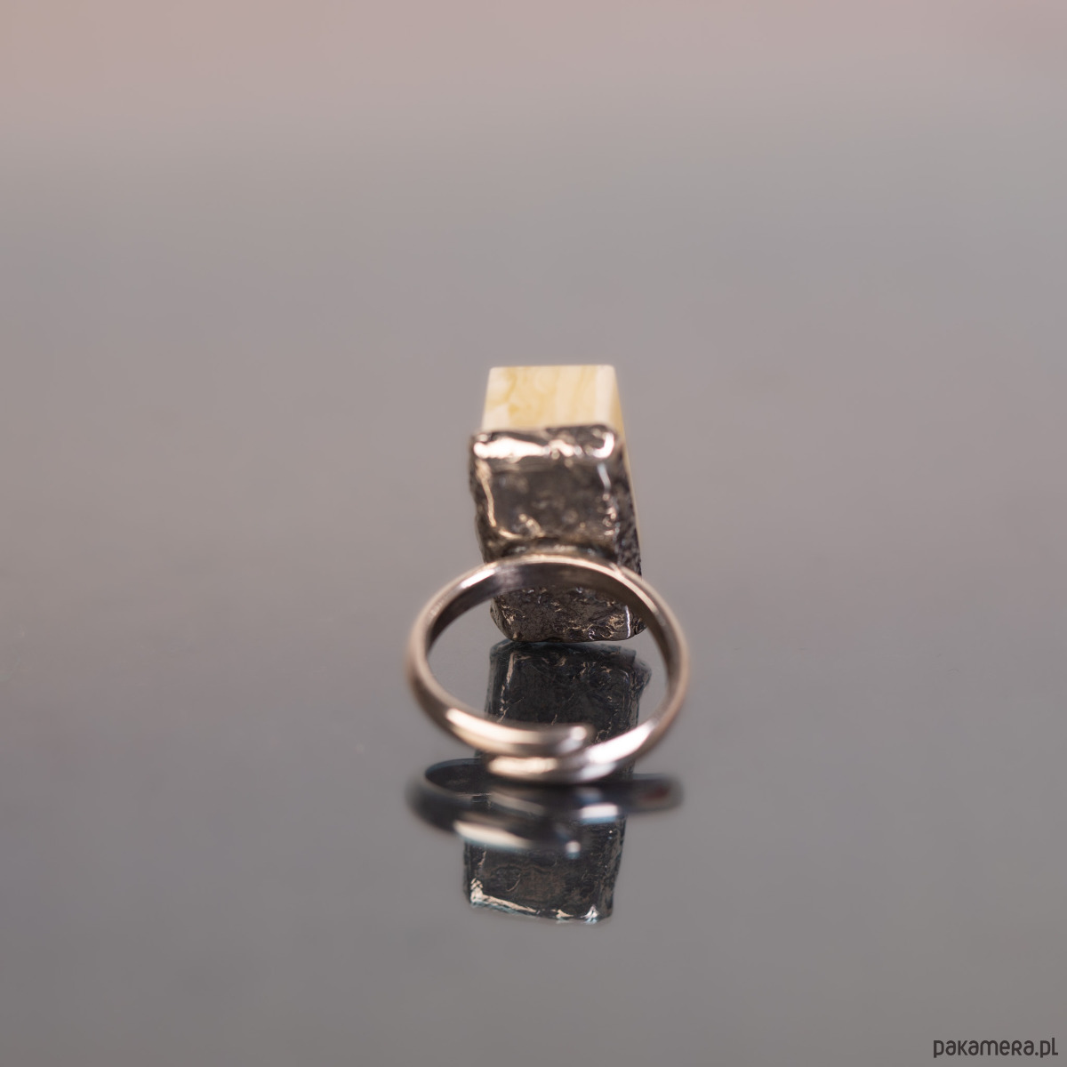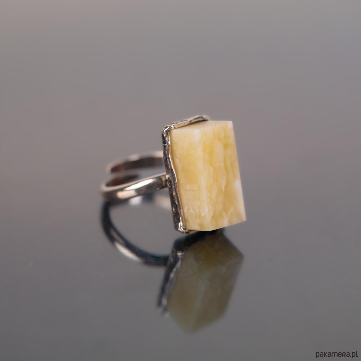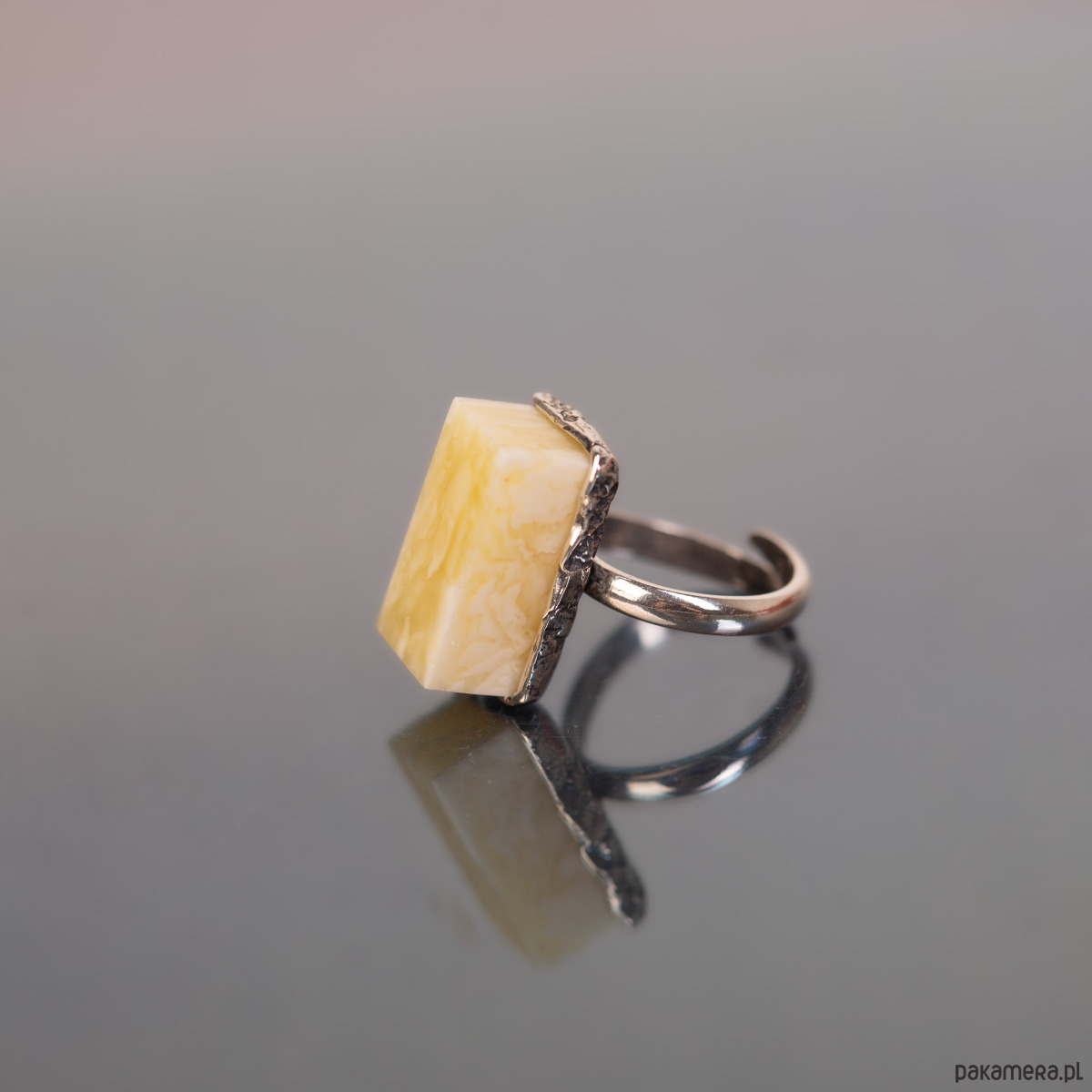 Srebro próby 925 · naturalny bursztyn bałtycki (mleczny) · waga 7 g · bursztyn 2 × 1 cm · oprawa 1,2 × 2,2 cm · wysokość 1 cm · obrączka regulowana EU 9–20 · wykonanie ręczne, praca autorska