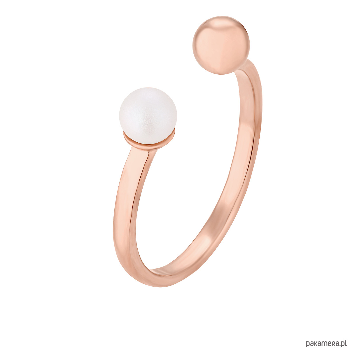 Złoty pierścionek zdobiony kuleczką i perłą w kolorze perłowym opalizującym Pearlescent. Wszystkie elementy wykonane ze srebra 925 powlekanego 18 karatowym różowym złotem.