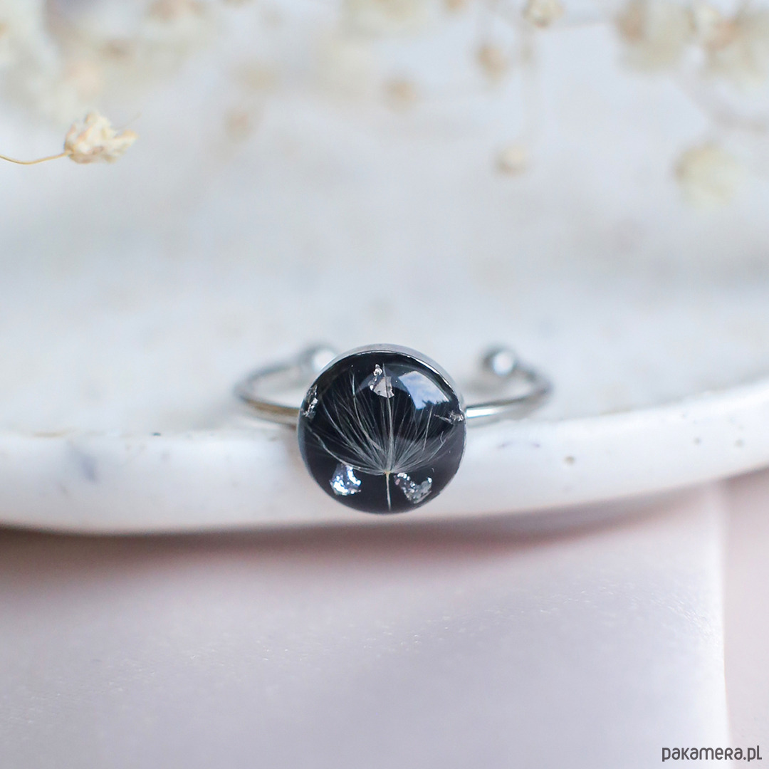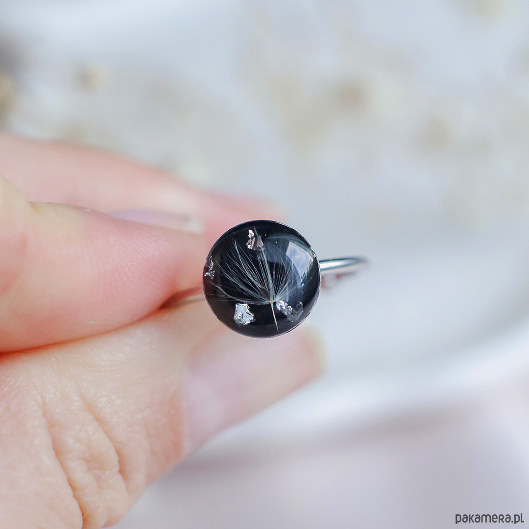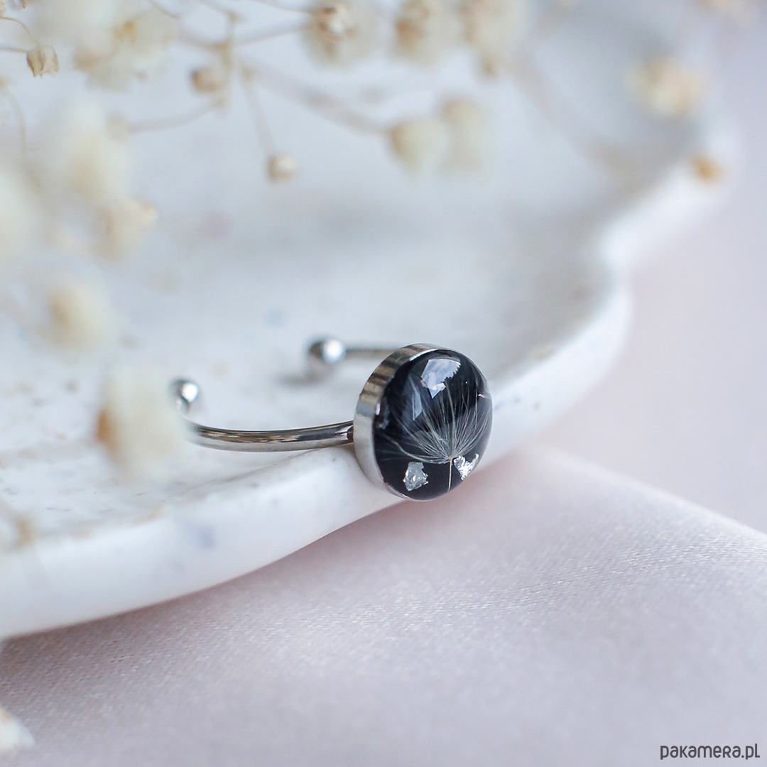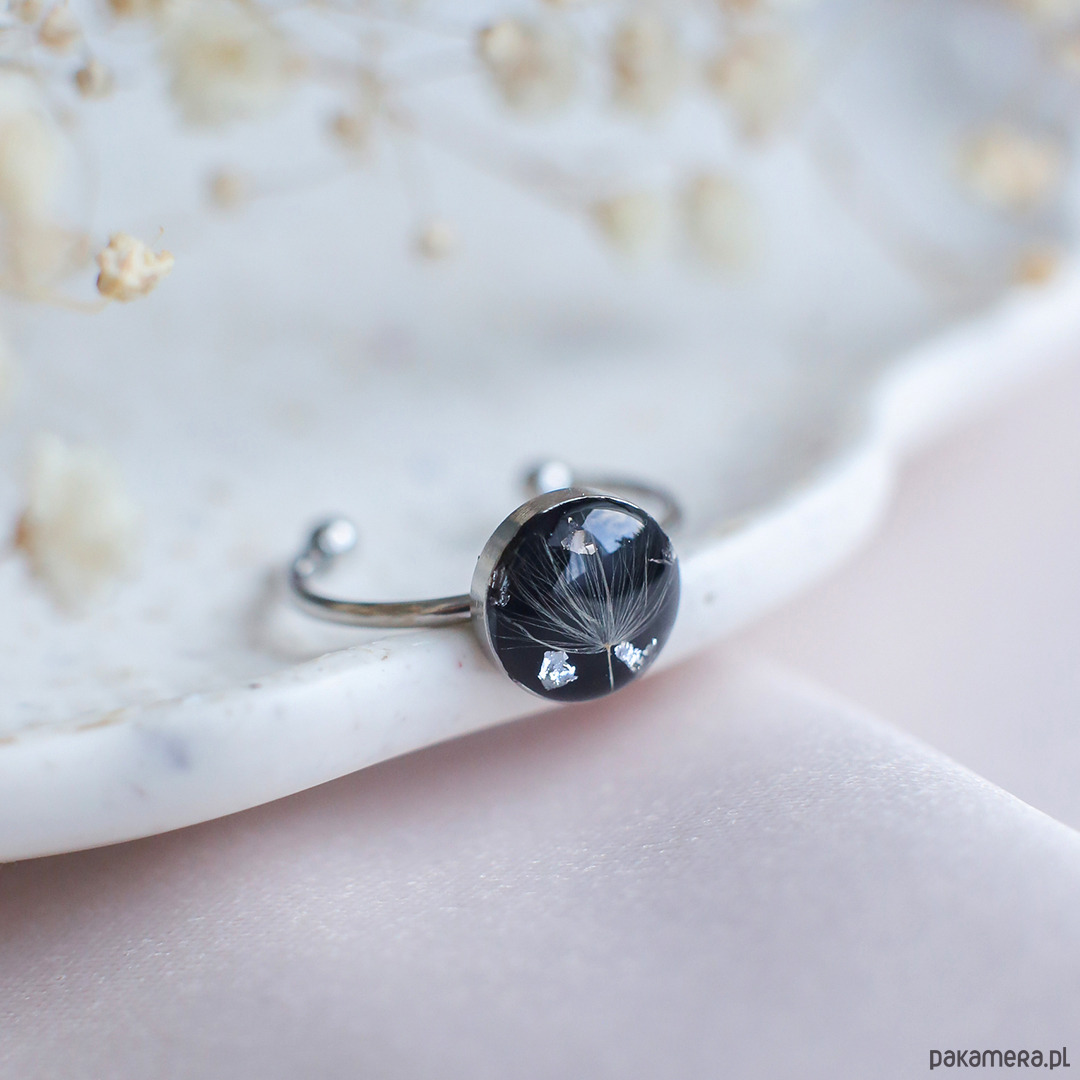 Pierścionek wykonany jest z żywicy epoksydowej z wykorzystaniem suszonych kwiatów. Metalowe elementy to stal nierdzewna szlachetna chirurgiczna.