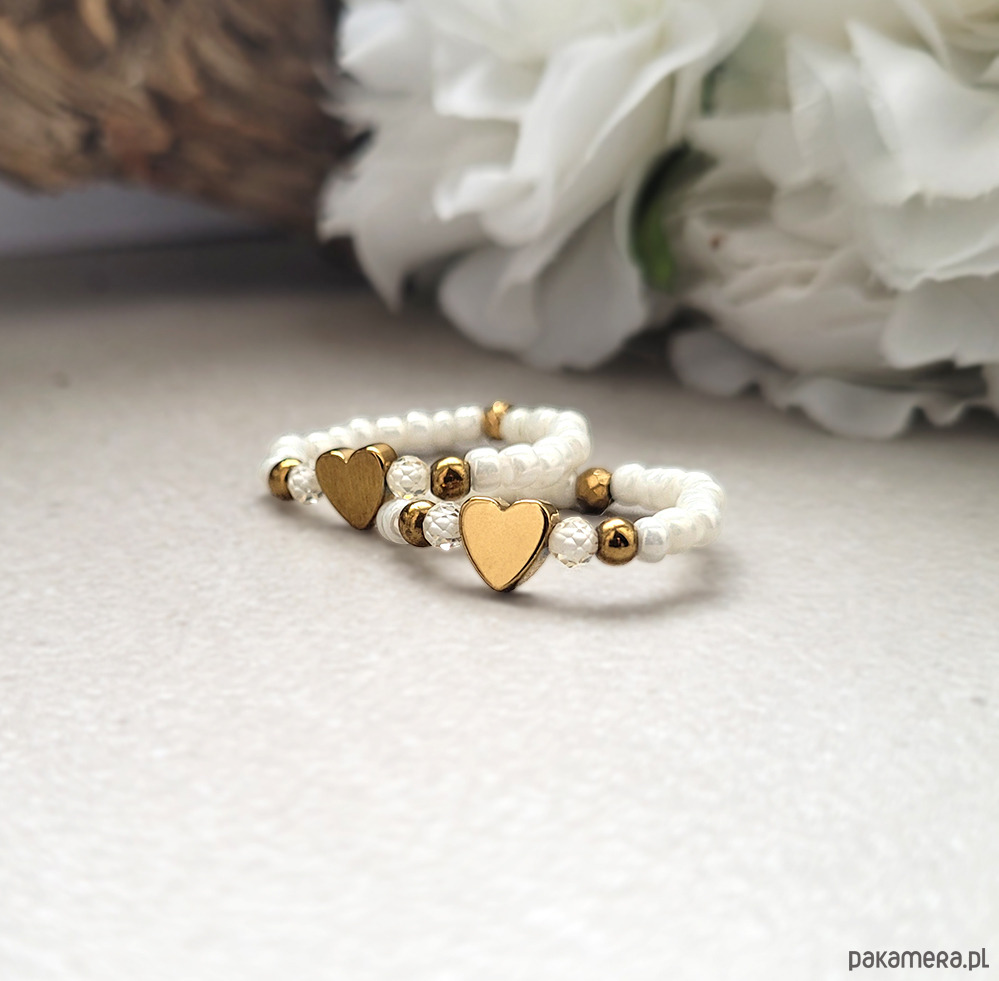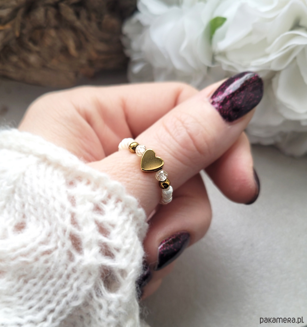Kamień naturalny Hematyt - serduszko 6mm oraz przekładki 3mm, Cyrkonie 3mm, najwyższej jakości koraliki TOHO ecru- by pieścionek był bardzo wygodny do noszenia na co dzień.