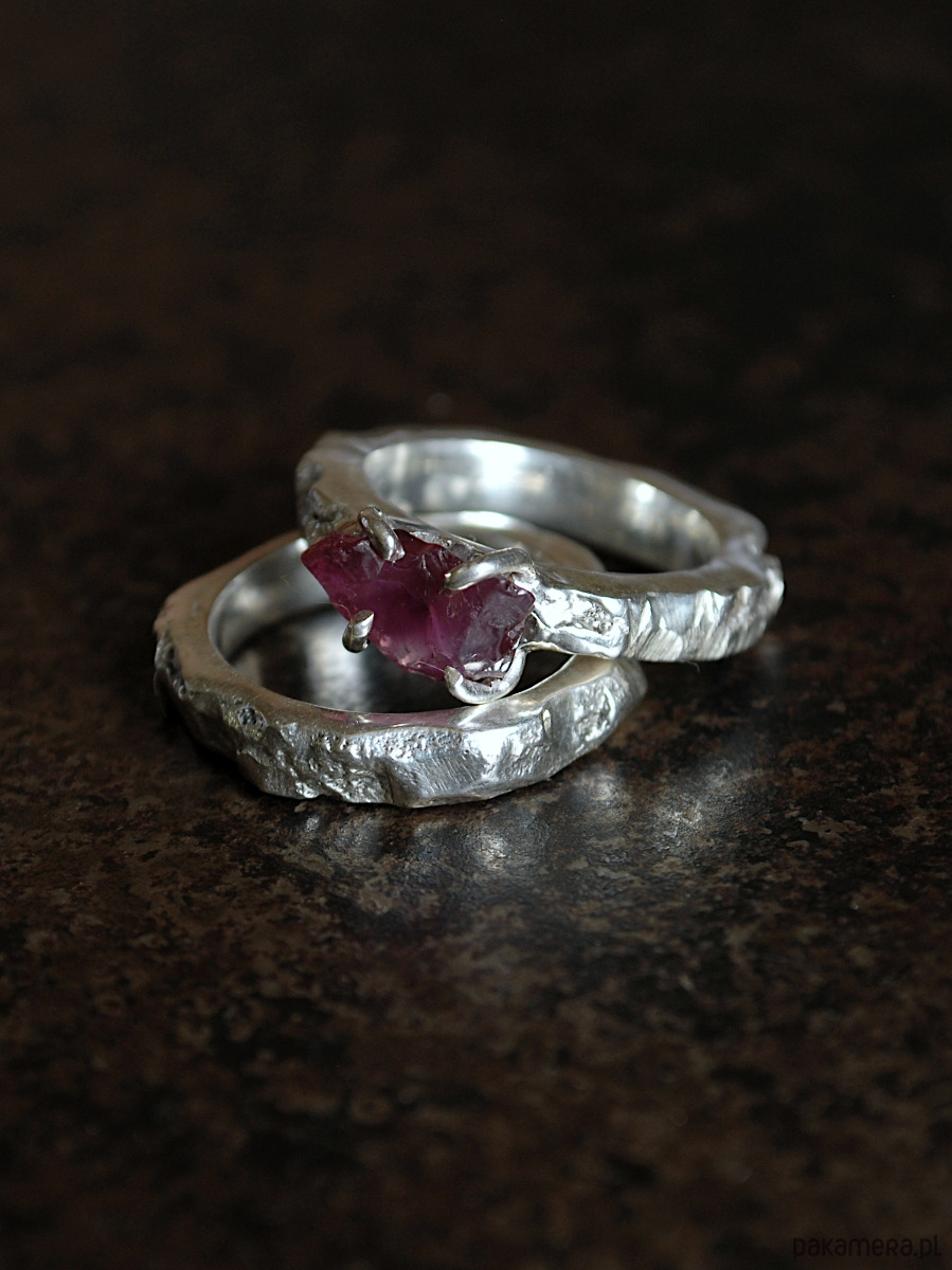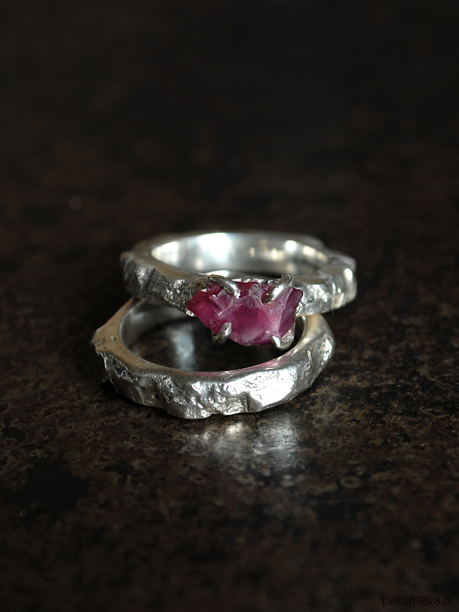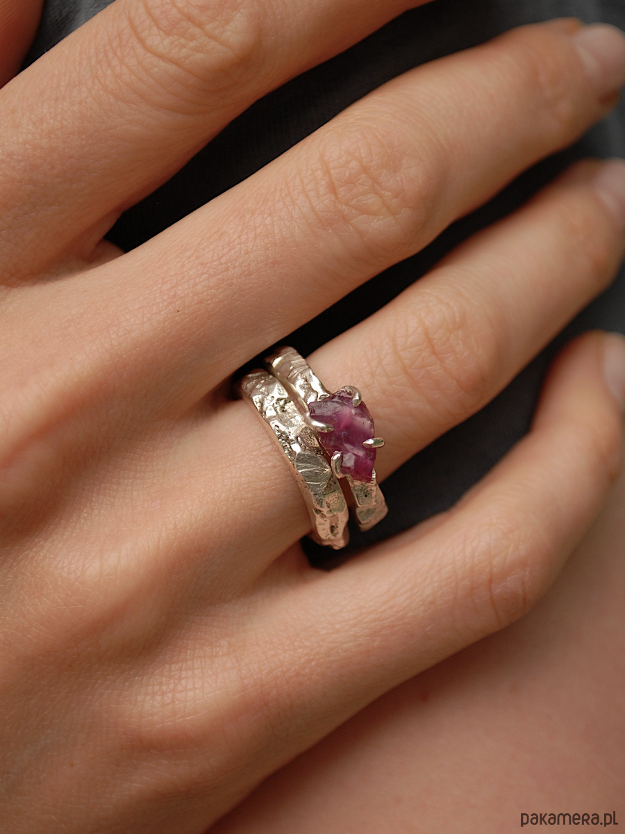 Wyjątkowy pierścionek z niepowtarzalnym kamieniem - surowym rubinem pochodzącym z Tanzanii. Kamień ma nieregularny kształt i ciemnoróżową barwę. Gdzieniegdzie można dostrzec metaliczne inkluzje rutylu, co czyni ten kamień jeszcze bardziej oryginalnym. Przybliżone wymiary kamienia to 7 x 11 mm. W komplecie jest obrączka, o fakturze pasującej do paska pierścionka, przywodzącej na myśl surową fakturę skały.