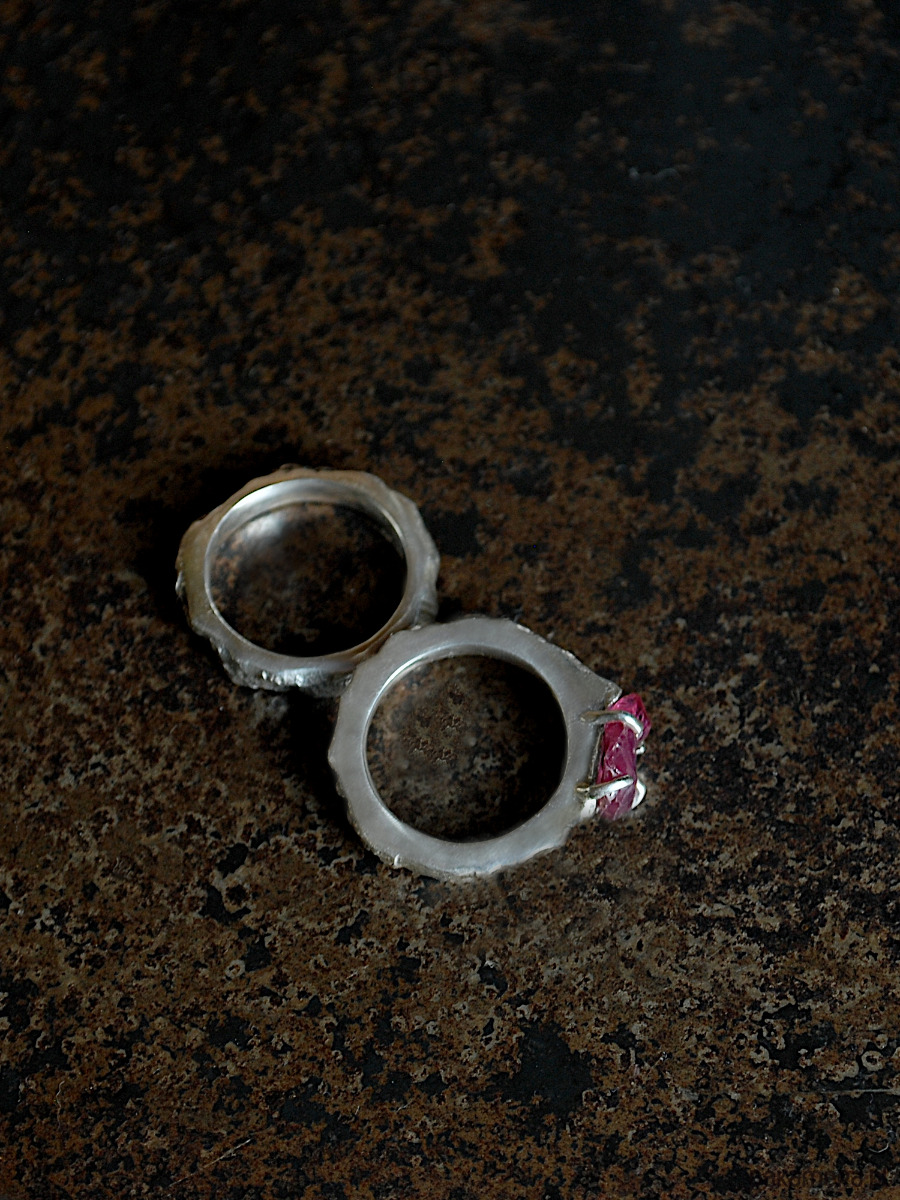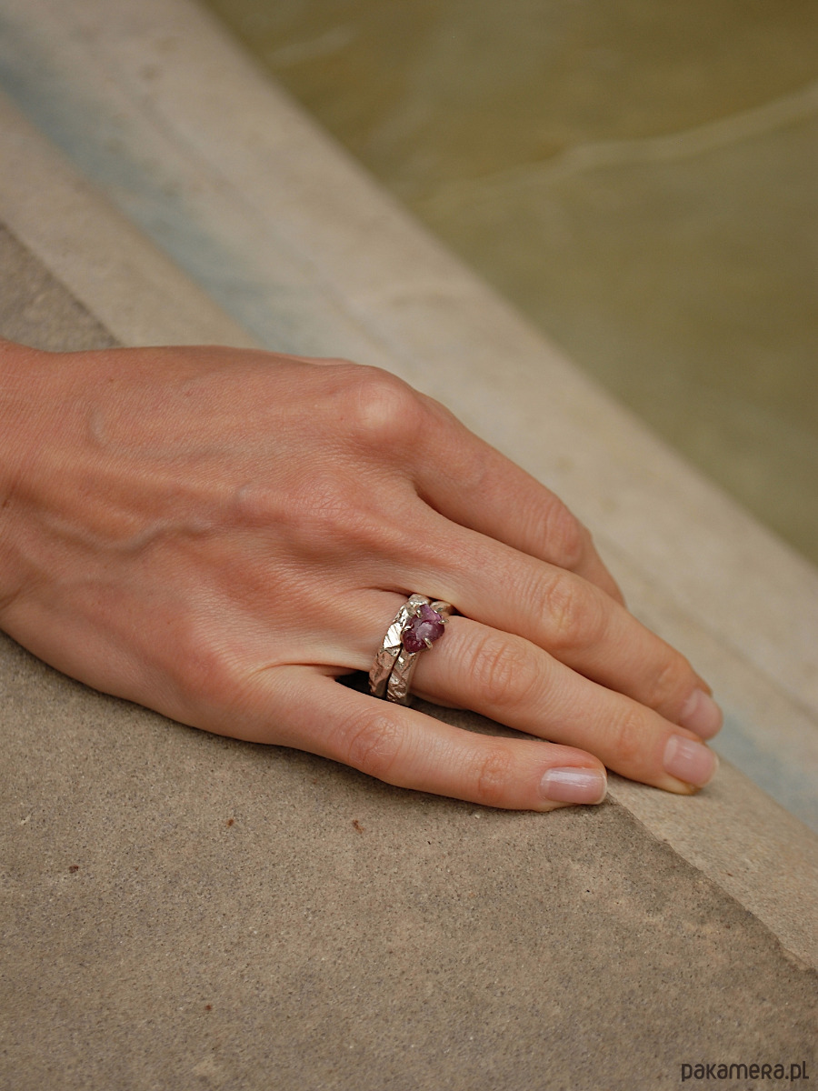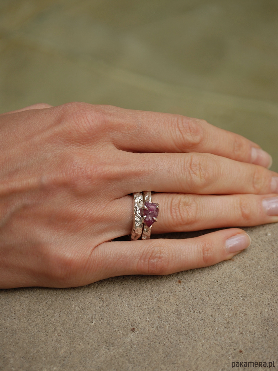 Wyjątkowy pierścionek z niepowtarzalnym kamieniem - surowym rubinem pochodzącym z Tanzanii. Kamień ma nieregularny kształt i ciemnoróżową barwę. Gdzieniegdzie można dostrzec metaliczne inkluzje rutylu, co czyni ten kamień jeszcze bardziej oryginalnym. Przybliżone wymiary kamienia to 7 x 11 mm. W komplecie jest obrączka, o fakturze pasującej do paska pierścionka, przywodzącej na myśl surową fakturę skały.