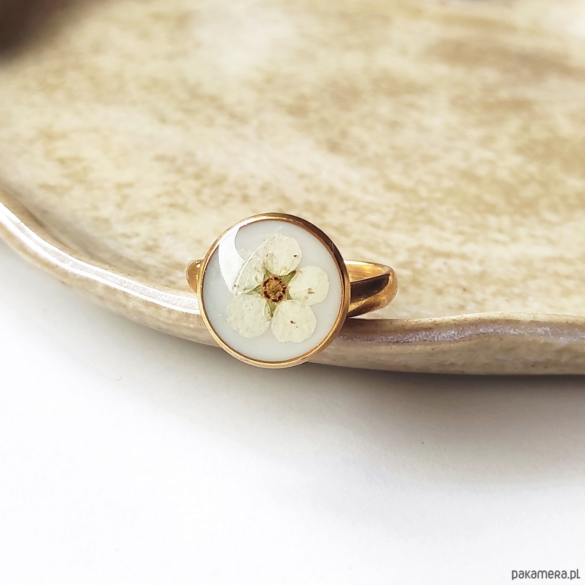 Pierścionek ze stali chirurgicznej z kwiatami tawuły na białym tle.