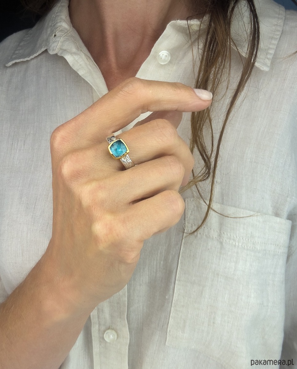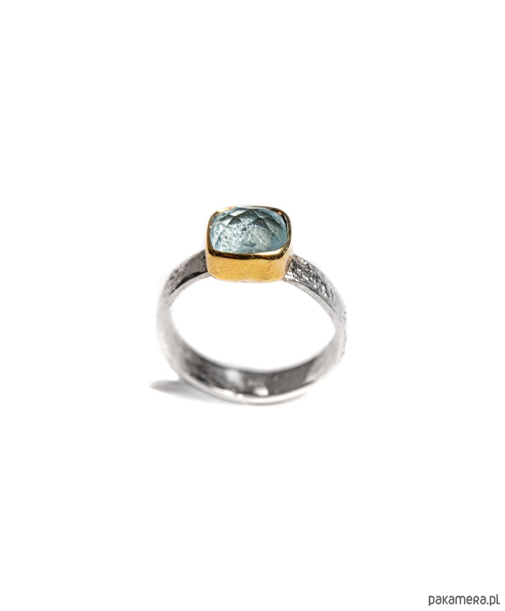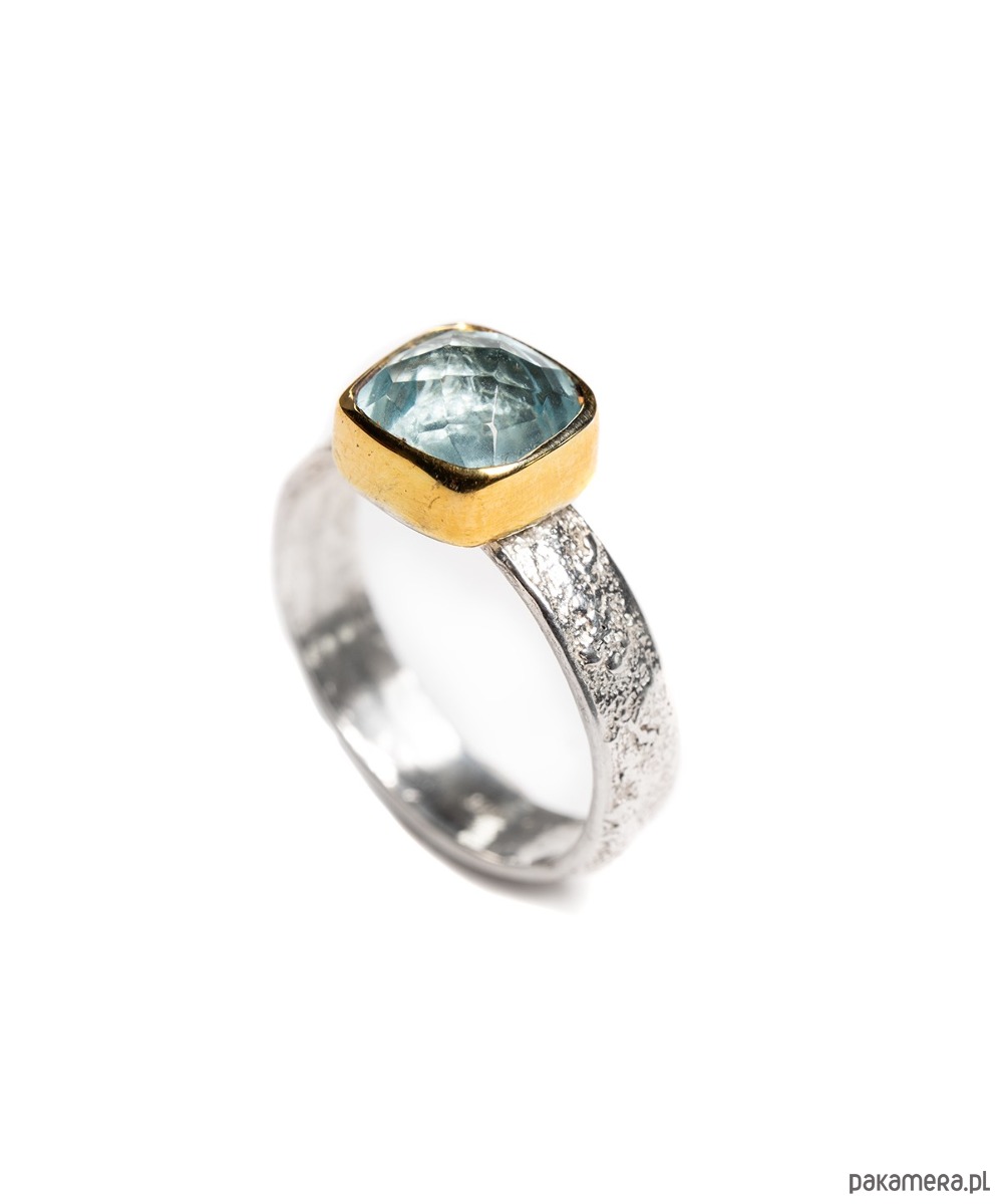 Pierścionek wykonany ręcznie. Błękitny, fasetowany topaz, został osadzony w złoconej oprawie na szerokiej, lekko pękatej obrączce o fakturowanej powierzchni. Srebro pr. 925. Oprawa kamienia złocona 24k złotem.