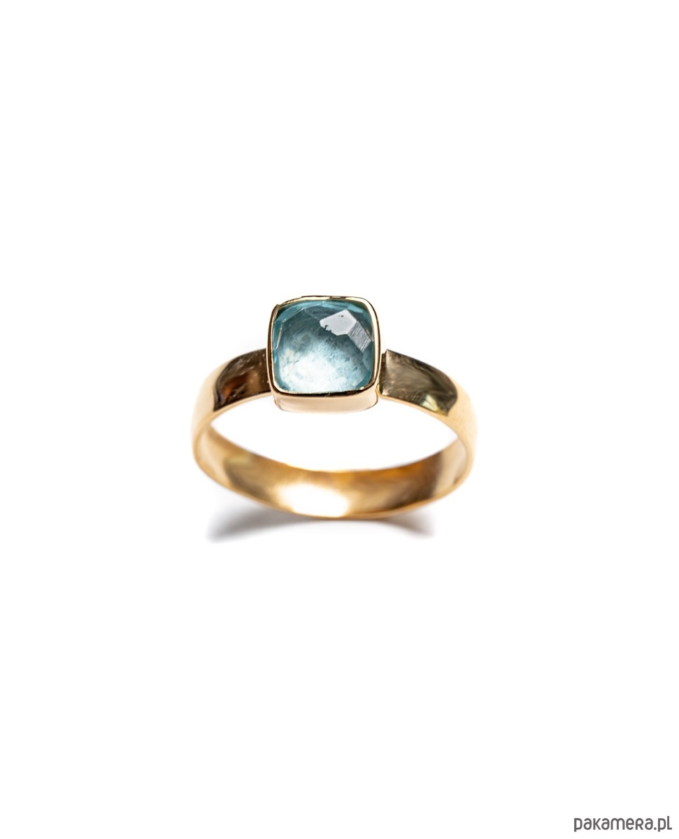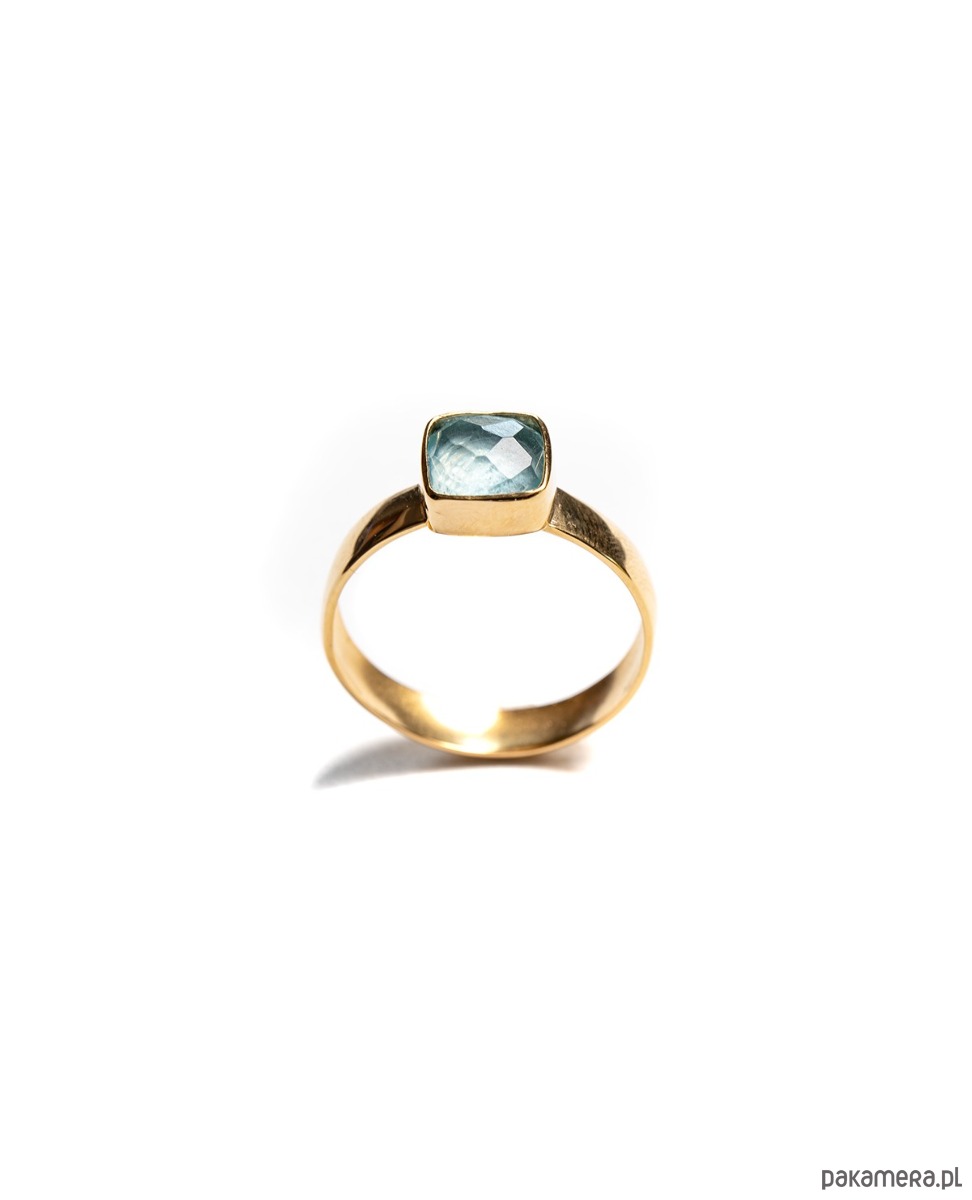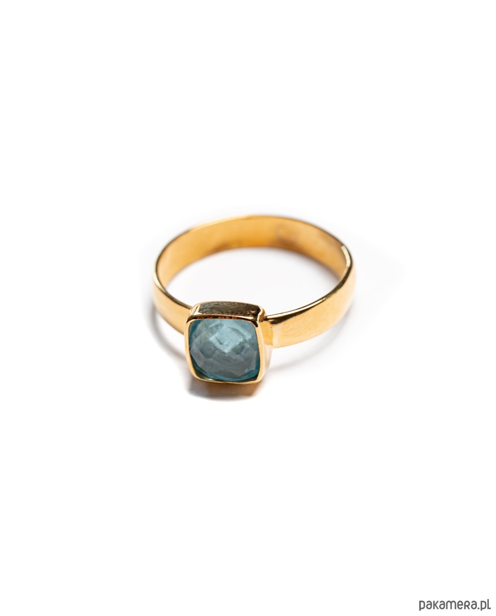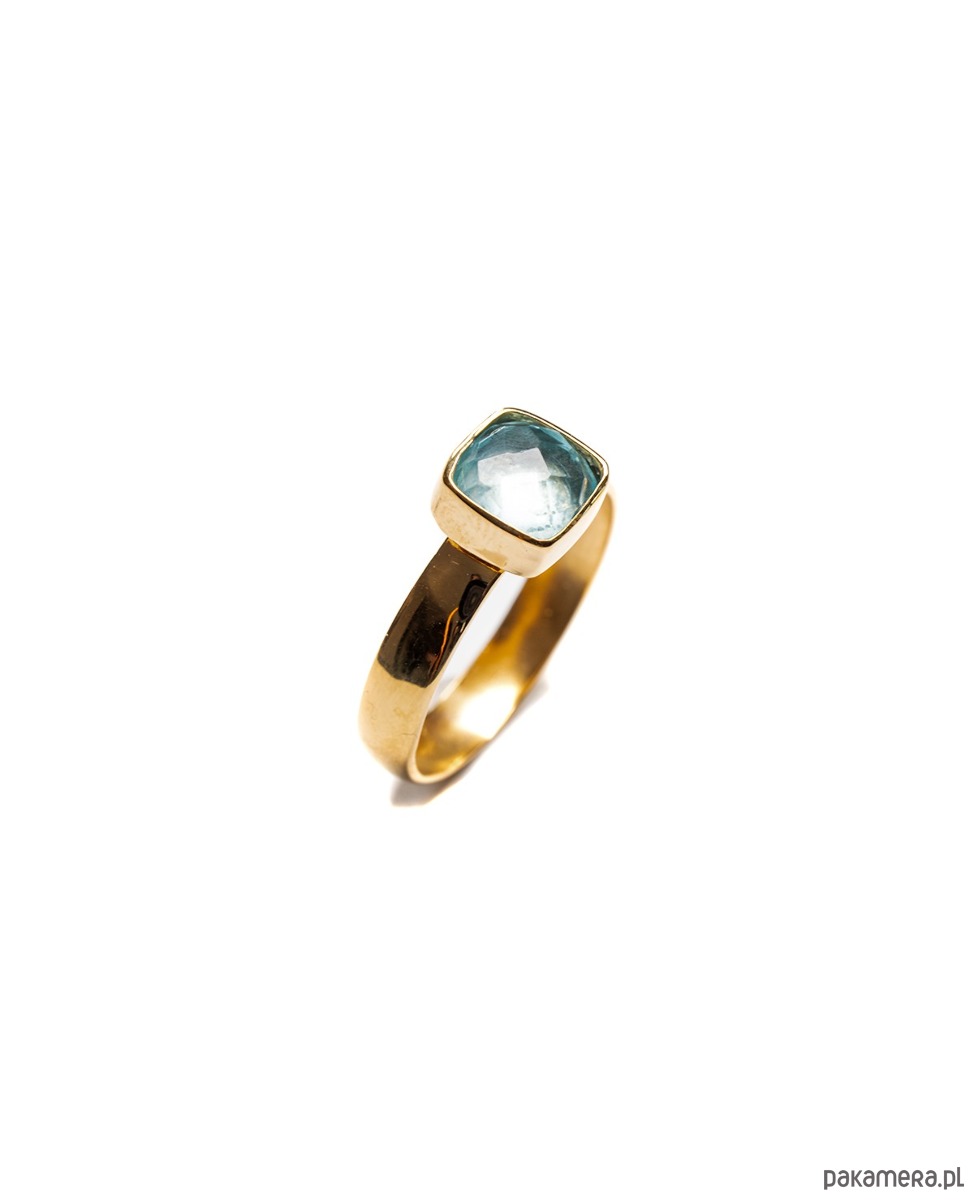 Ręcznie wykonany pierścionek ze srebra 925, pozłoconego 24 karatowym złotem. W centrum błyszczy fasetowany, naturalny topaz - lekki jak kropla wody. Osadzony w złoconej oprawie na szerokiej, lekko pękatej obrączce. To pierścionek dla osób, które wybierają jakość, świadomy styl i ponadczasowe piękno.