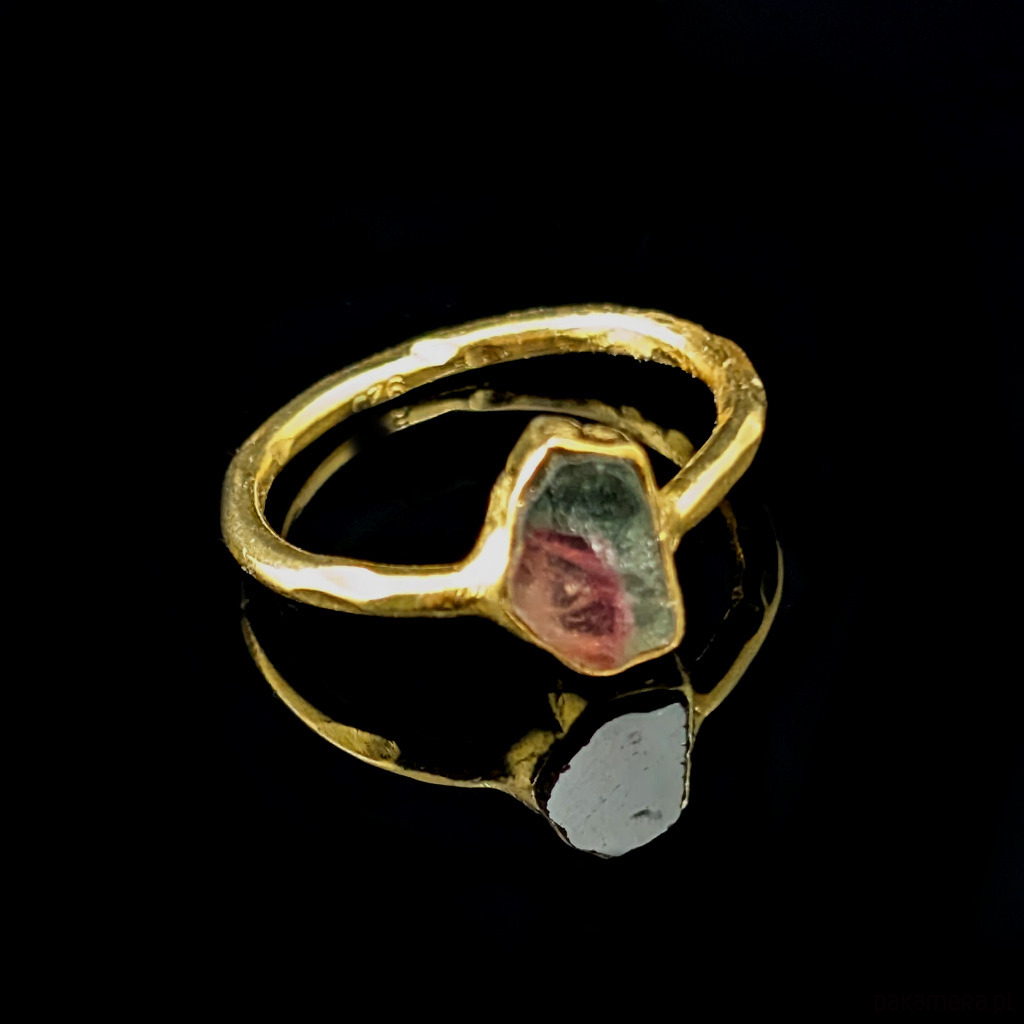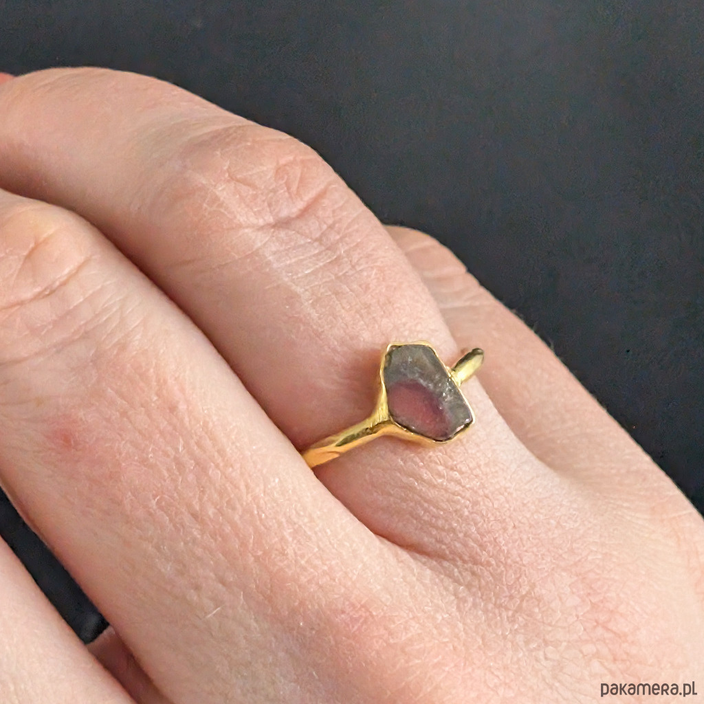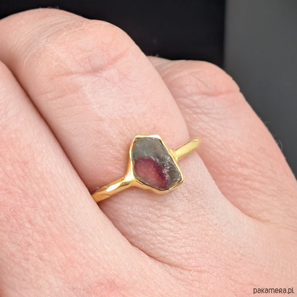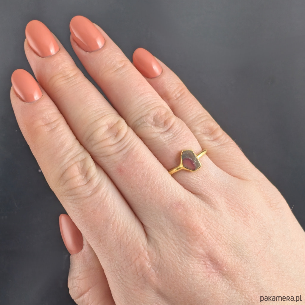 Elegancki i nietuzinkowy pierścionek wykonany z pozłacanego srebra próby 925 oraz pieknego arbuzowego turmalinu w odceniach różu i morskiego. Wymiary całej oprawy 8 x 6 mm, Waga 1,63 grama. Rozmiar jubilerski 12,mogę powiększyć na max 13. Złocone powłoki srebra są delikatnie, z czasem mogą się ścierać. Wykonany przez dostawcę kamieni. Pierścionek wysłany w ozdobnym pudełeczko.