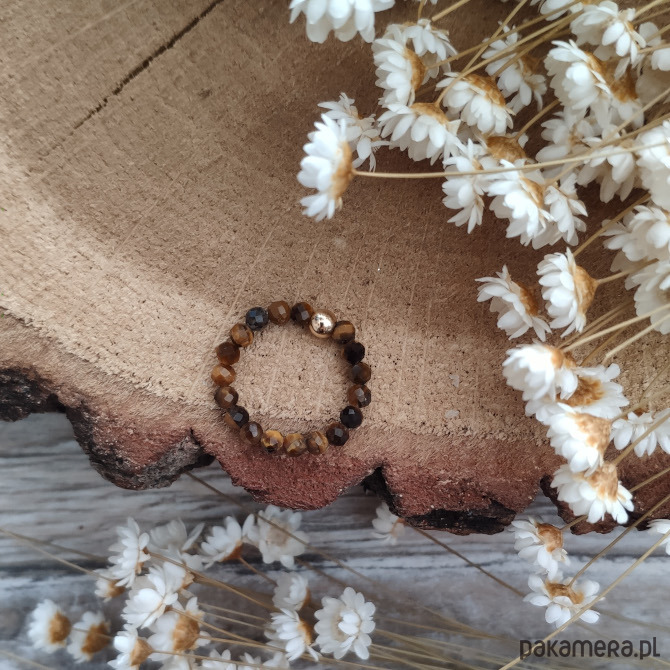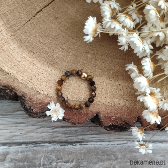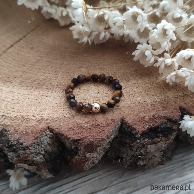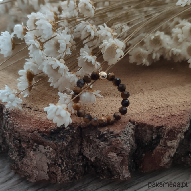 Inspirowana barwami złotej polskiej jesieni pierścionek z tygrysim okiem - minerałem nieoczywistym, który zmienia swoją barwę i migocze w blasku słońca. Możesz podziwiać całą paletę brązów, odcieni złota, a nawet czerni. Szlif fasetowy sprawia, że minerały pięknie odbijają światło, a dzięki wykończeniu ozdobną kuleczką w kolorze złotym, całość nabiera eleganckiej formy.
