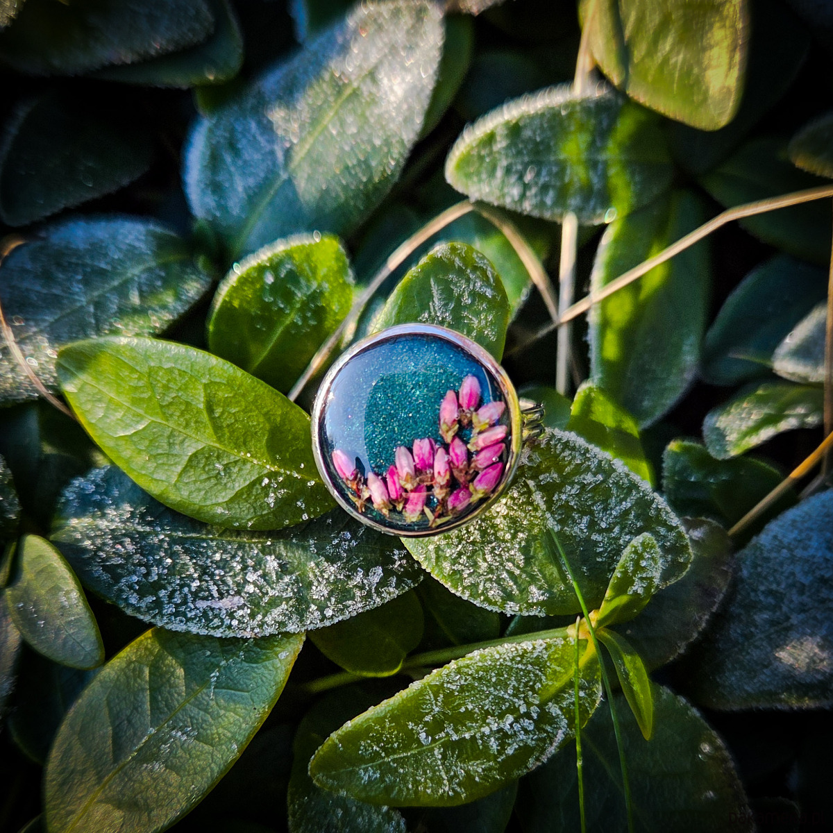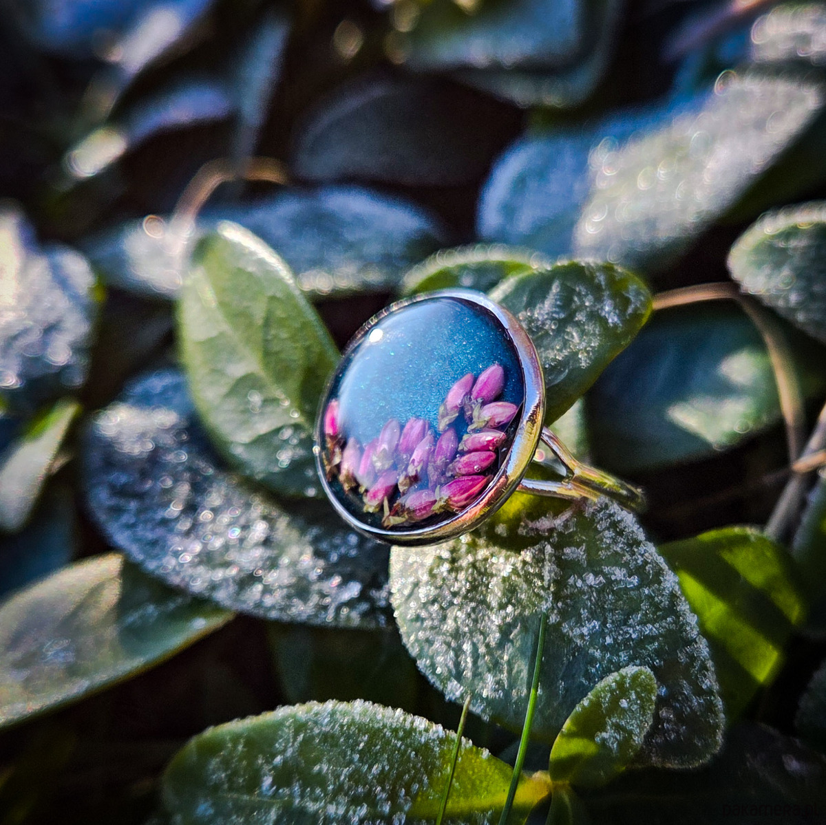 Pierścionek z zatopionymi w żywicy epoksydowej płatkami wrzosów.
