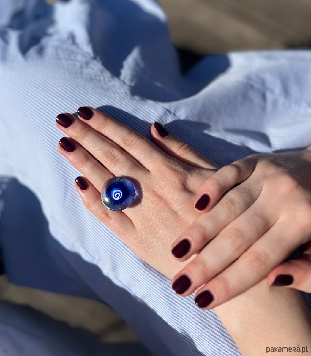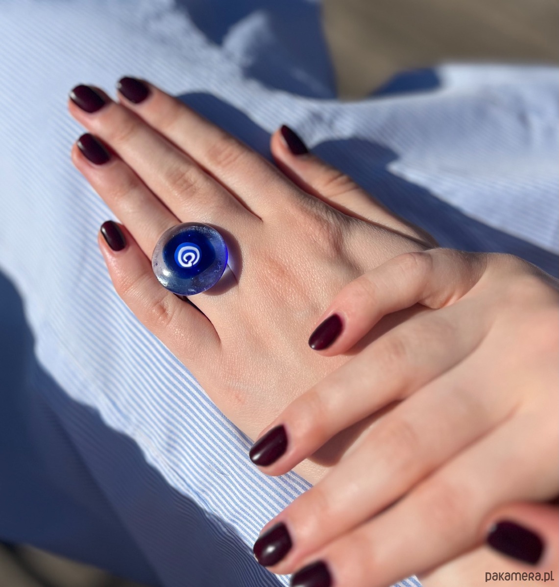 Oryginalny, nowoczesny pierścień z wymiennym, wkręcanym oczkiem wykonanym ze szkła techniką glass fusing. Oczko jest wykonane ręcznie. Dzięki zastosowanej technice jest jedyne w swoim rodzaju, odporne na zarysowania i bardzo trwałe. Średnica oczka ok. 3,5 cm.