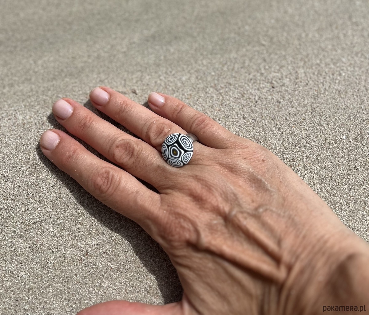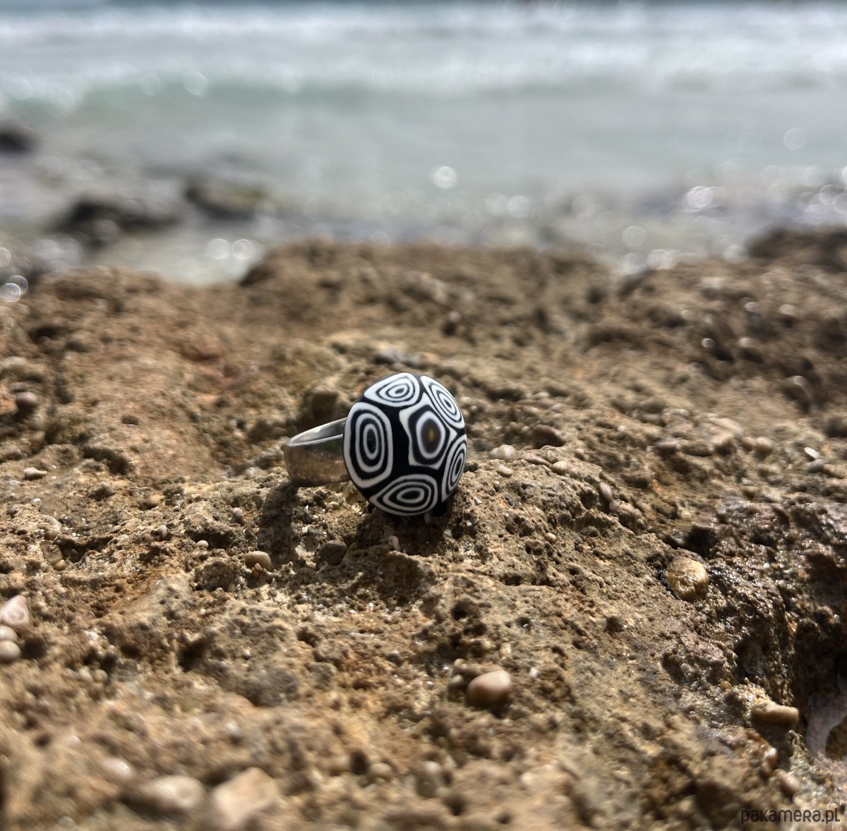 Oryginalny nowoczesny pierścionek z małym, wymiennym, wkręcanym oczkiem wykonanym z włoskiego szkła