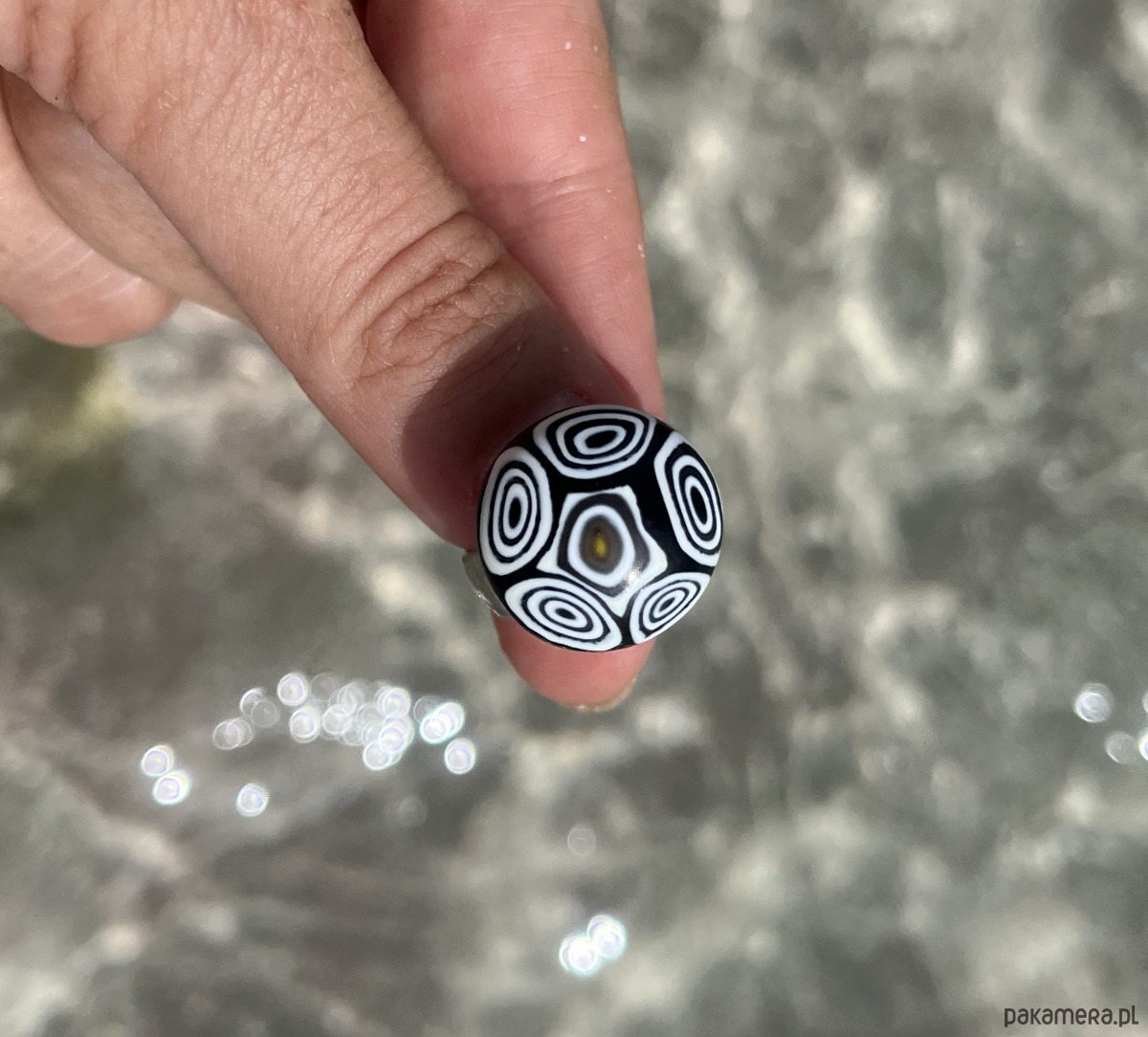 murrini techniką glass fusing. Oczko jest wykonane ręcznie. Dzięki zastosowanej technice jest jedyne w swoim rodzaju, odporne na zarysowania i bardzo trwałe. Średnica oczka około 1,8 cm.