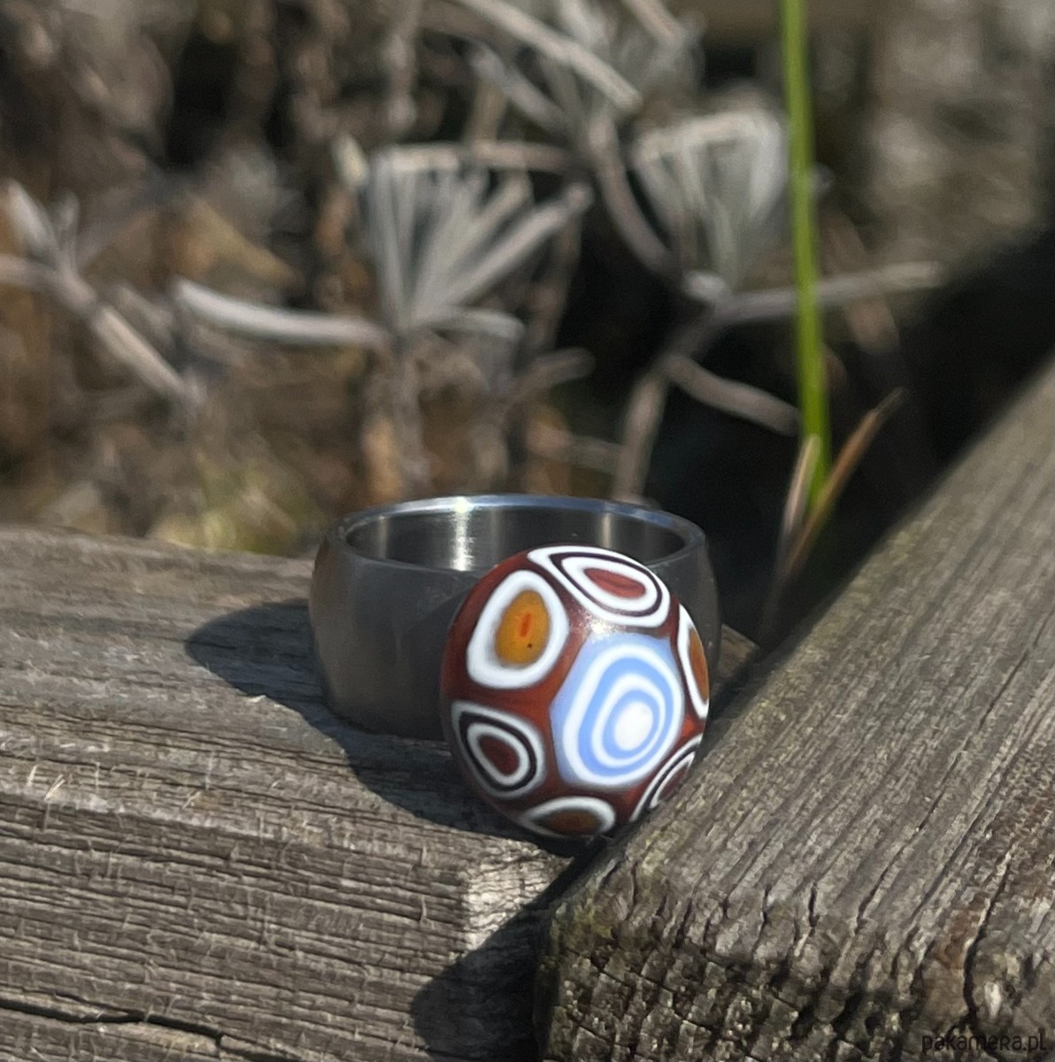 Oryginalny nowoczesny pierścionek z małym, wymiennym, wkręcanym oczkiem wykonanym z włoskiego szkła