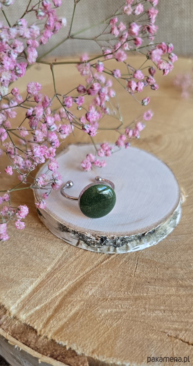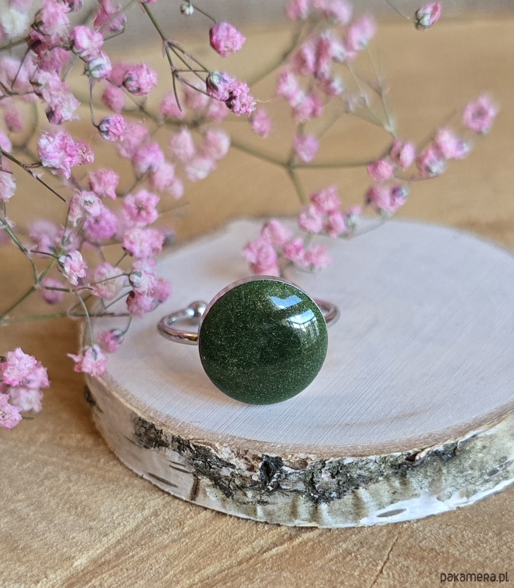 Pierścionek z zielonym oczkiem dużym brokatowym butelkowa zieleń