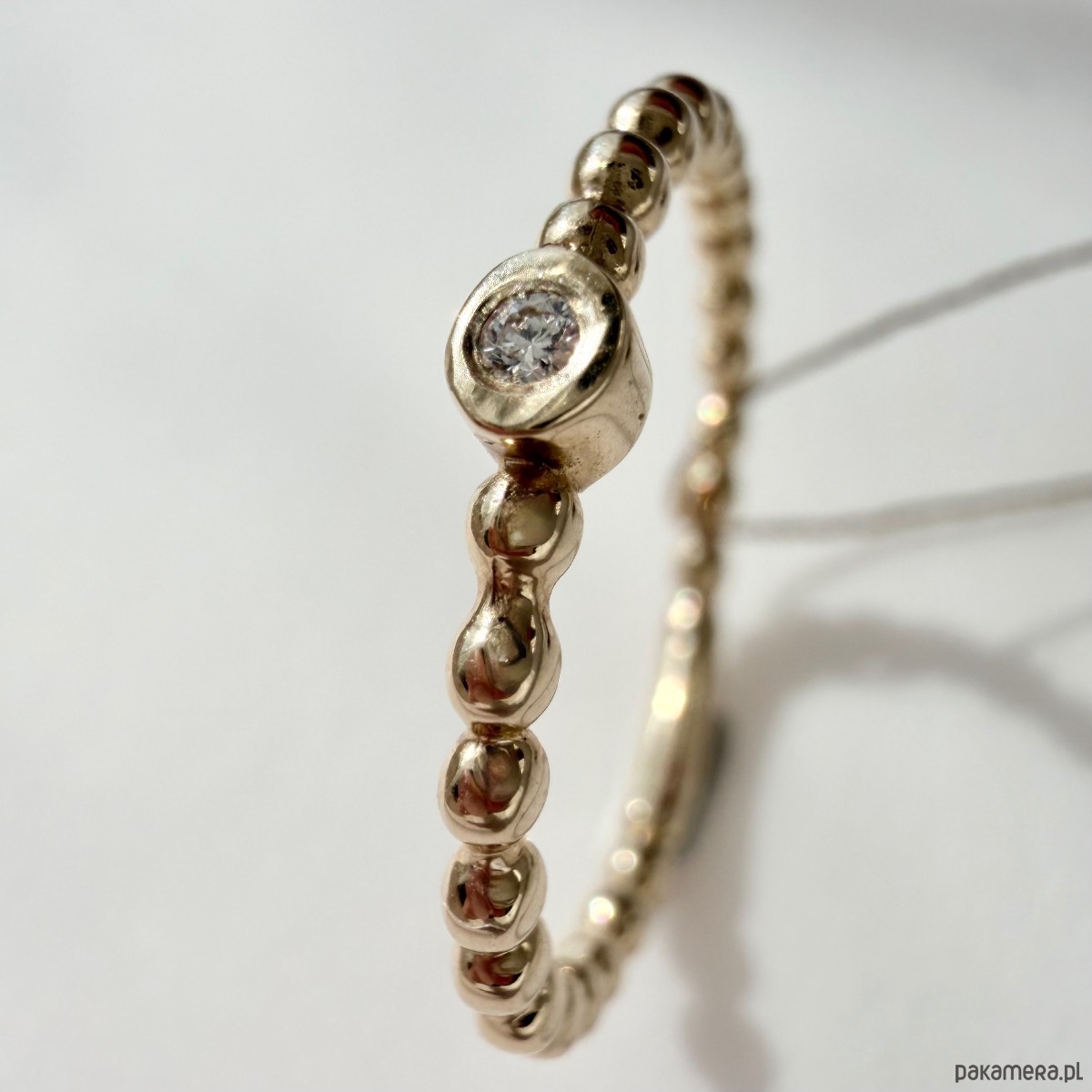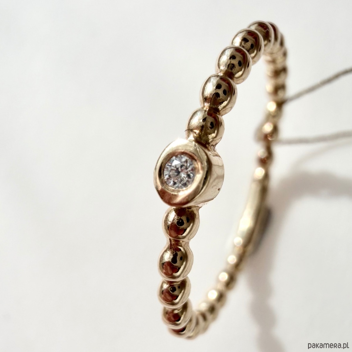 Pierścionek został wykonany z żółtego złota próby 585 (Au 585), które zachwyca klasycznym, ciepłym odcieniem i trwałością. W centralnej części oprawiono brylant o masie 0,02 ct, w jakości P/H, który subtelnie odbija światło i dodaje całości eleganckiego wykończenia.
