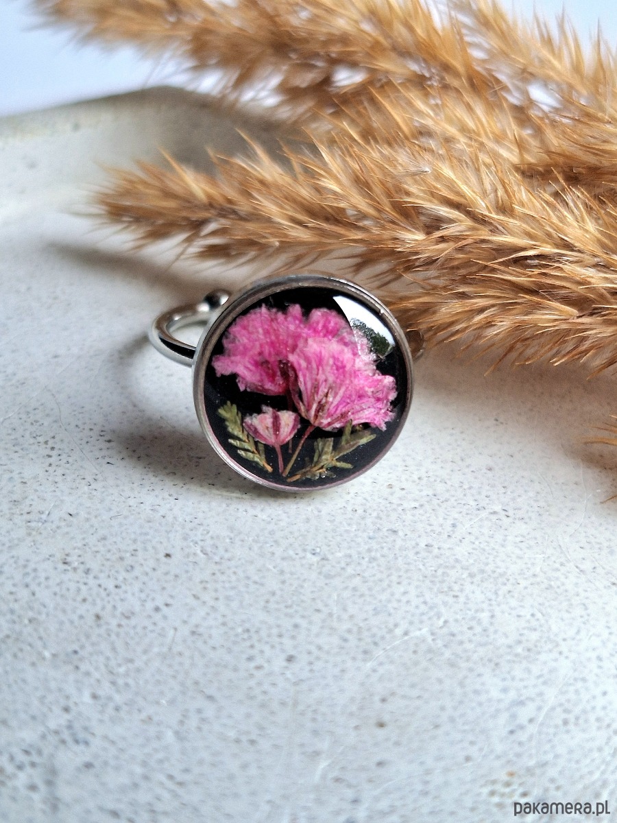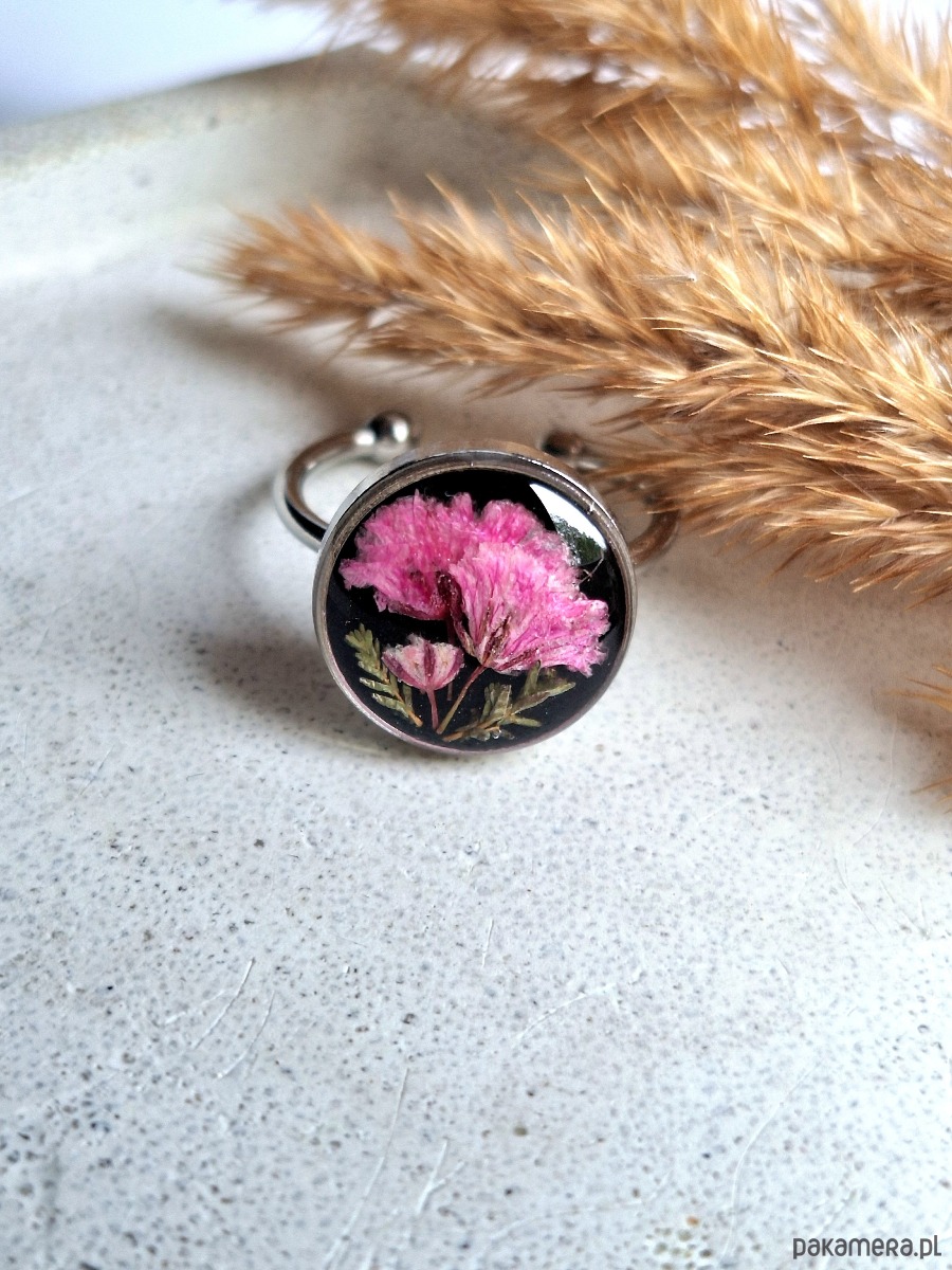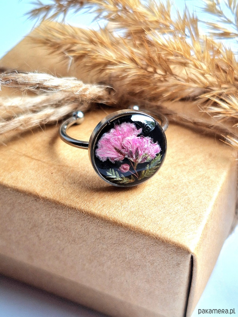 Uroczy pierścionek z zatopionymi kwiatami różowej gipsówki na czrnym brokatowym tle w srebrnej oprawie. Wykonany z wysokiej klasy żywicy, która nie zmienia koloru pod wpływem promieniowania uv oraz wysokiej jakości stali chirurgicznej. Rozmiar pierścionka jest regulowany.