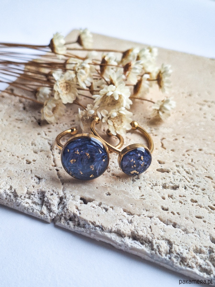 Uroczy pierścionek z zatopionymi płatkami chabra i płatkami złota. Wykonany z wysokiej klasy żywicy, która nie zmienia koloru pod wpływem promieniowania uv oraz wysokiej jakości stali chirurgicznej. Rozmiar pierścionka jest regulowany.