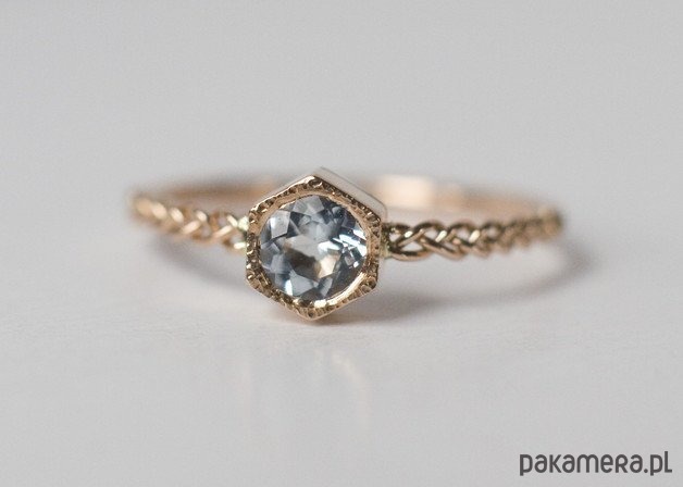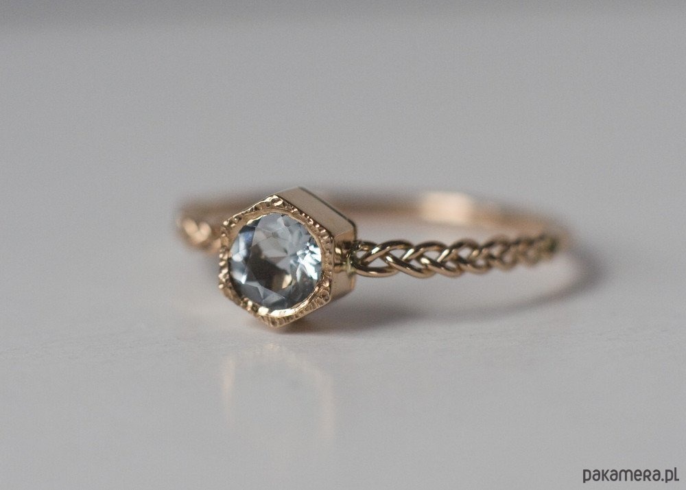 Pierścionek z jasno niebieskim akwamarynem wykonany ręcznie w żółtym złocie 585.
