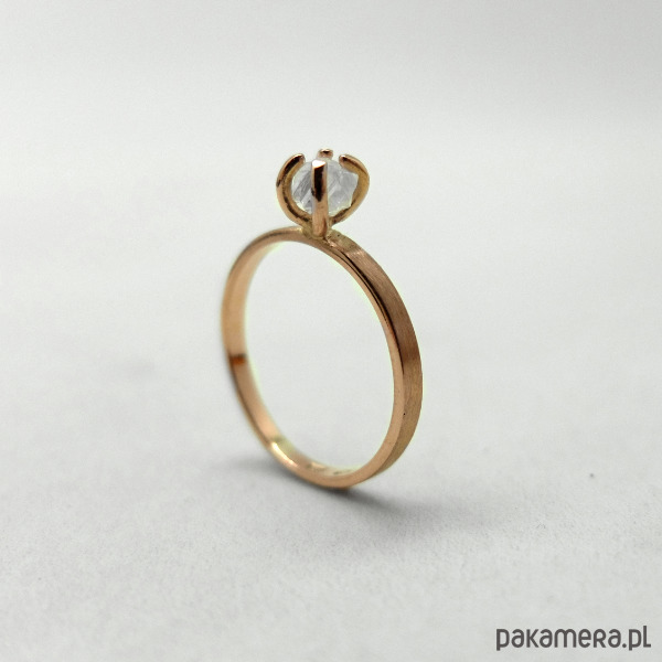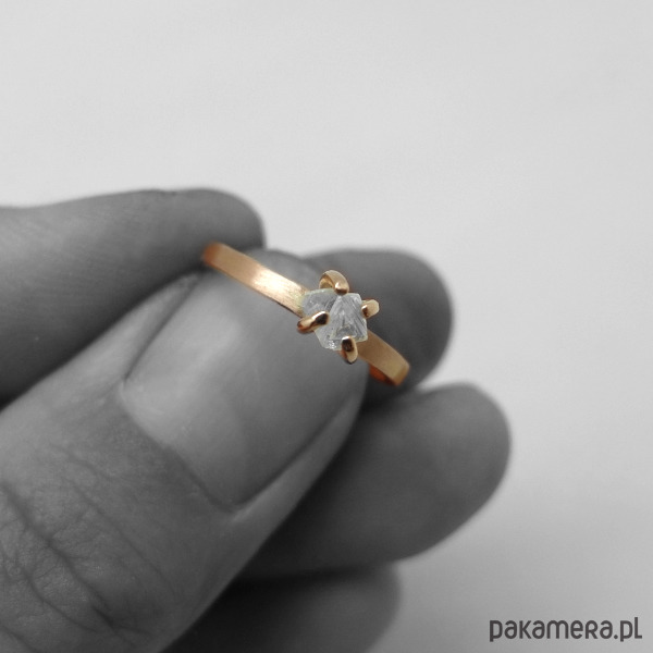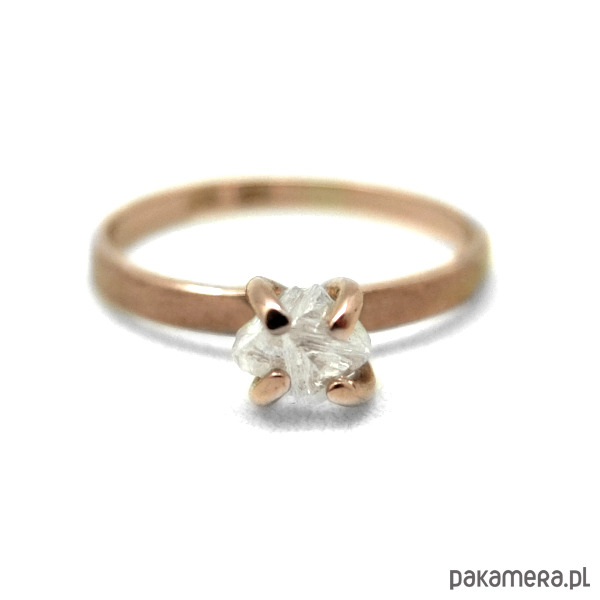 Delikatny pierścionek zaręczynowy z różowego złota próby 0,585 z surowym diamentem. Pierścionek szeroki na 2 mm. Jego powierzchnia zewnętrzna jest satynowa a wewnątrz jest wypolerowany. Każdy pierścionek będzie unikatowy ze względu na kształt użytego kamienia. Do produktu dołączony jest certyfikat. Proszę podać swój rozmiar jubilerski lub średnicę wewnętrzną pierścionka po złożeniu zamówienia.
