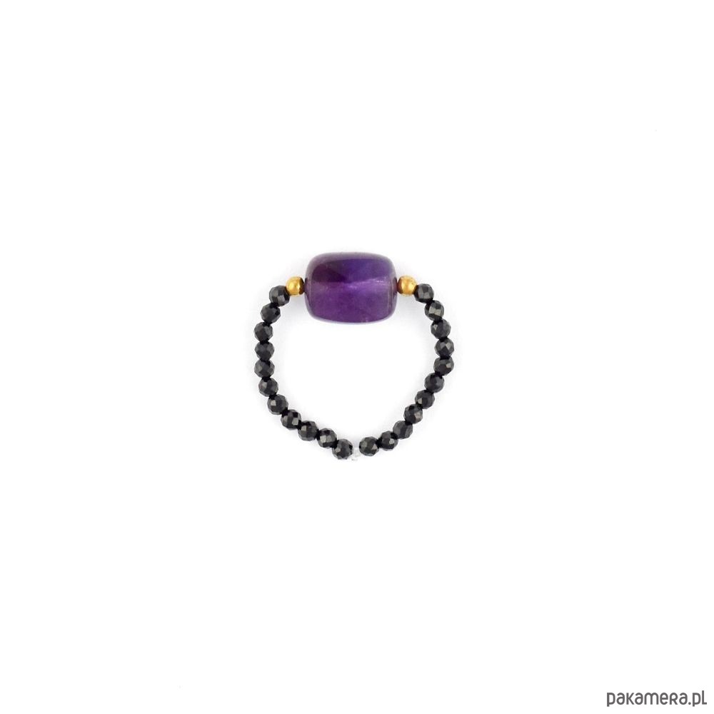 Pierścionek wykonany jest z naturalnych mini kamieni o wielkości 2 mm - Hematyt, 2 mm - Spinel oraz Pastylki Ametystu znajdującej się z centralnej części. Hematyt to kamień silnie energetyzujący. Silnie oczyszcza krew. Budzi radość do życia, dodaje odwagi i wiary we własne umiejętności. Ametyst to kamień regeneracji. Przywraca równowagę osobom podatnym na stres, uwalnia umysł od negatywnych myśli. Pomaga przy łagodzeniu konfliktów w życiu osobistym i zawodowym. Oczyszcza miejsca z negatywnej energii.