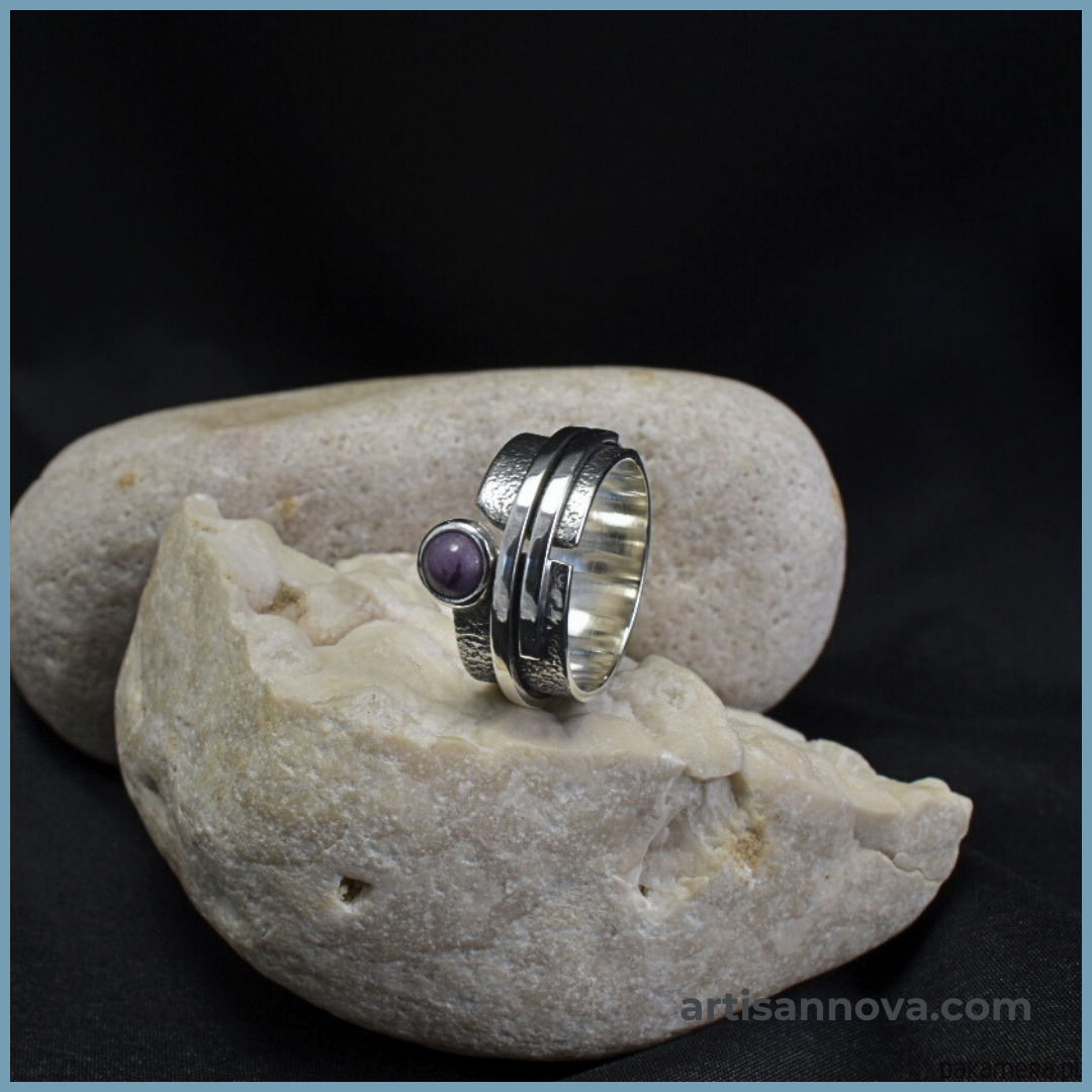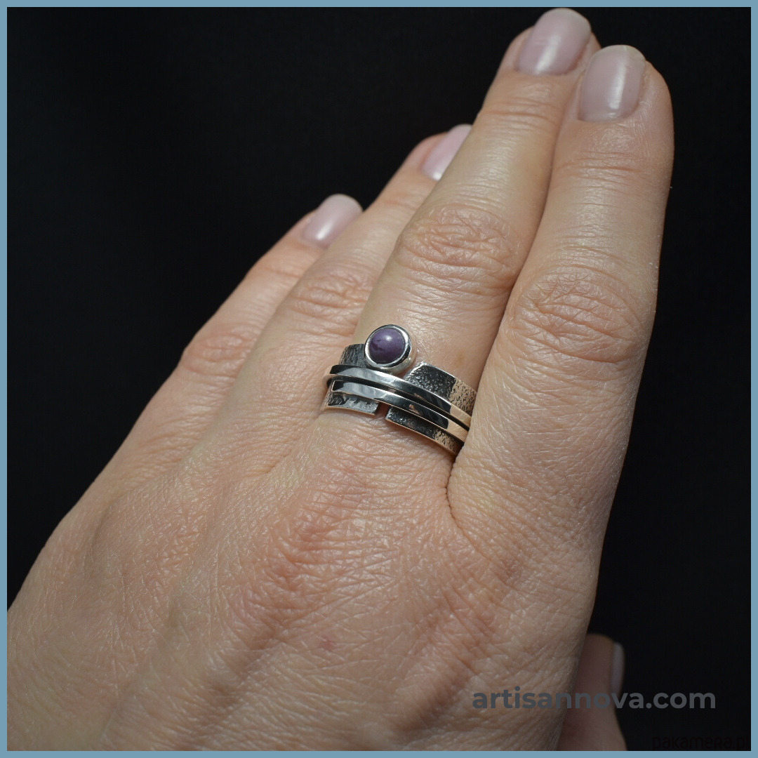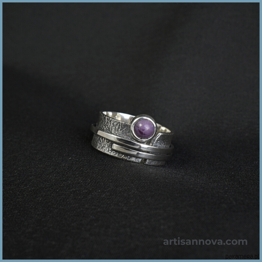Centralnym elementem pierścionka jest jadeit lawendowy o delikatnym, wrzosowym odcieniu. W kulturze Dalekiego Wschodu jadeit od wieków postrzegany był jako kamień równowagi, harmonii i wewnętrznego spokoju. W swojej lawendowej odmianie łączy symbolikę łagodności z dojrzałą refleksją i uważnością na emocje, co czyni go kamieniem subtelnym, ale znaczącym. W zestawieniu z surową strukturą srebra tworzy biżuterię, która nie dominuje, lecz towarzyszy.