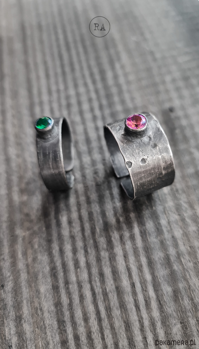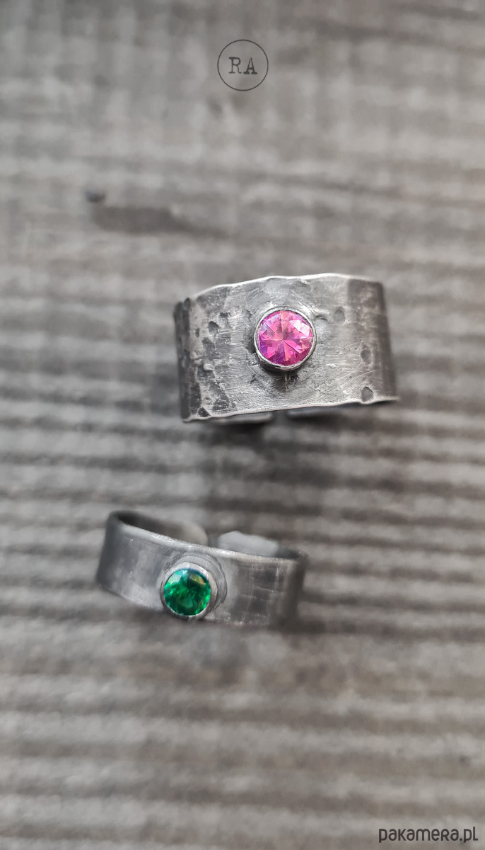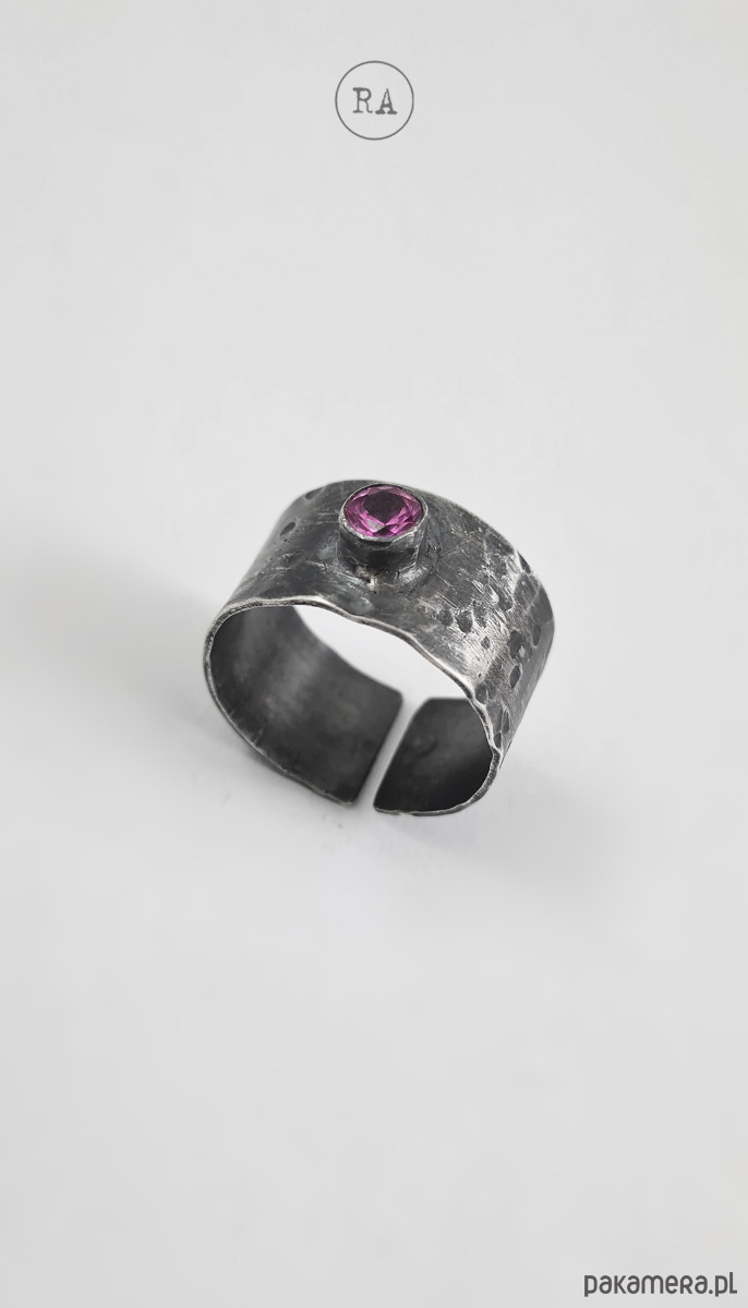 Pierścionek regulowany, wykonany ze srebra, o szerokości ok. 11 mm.