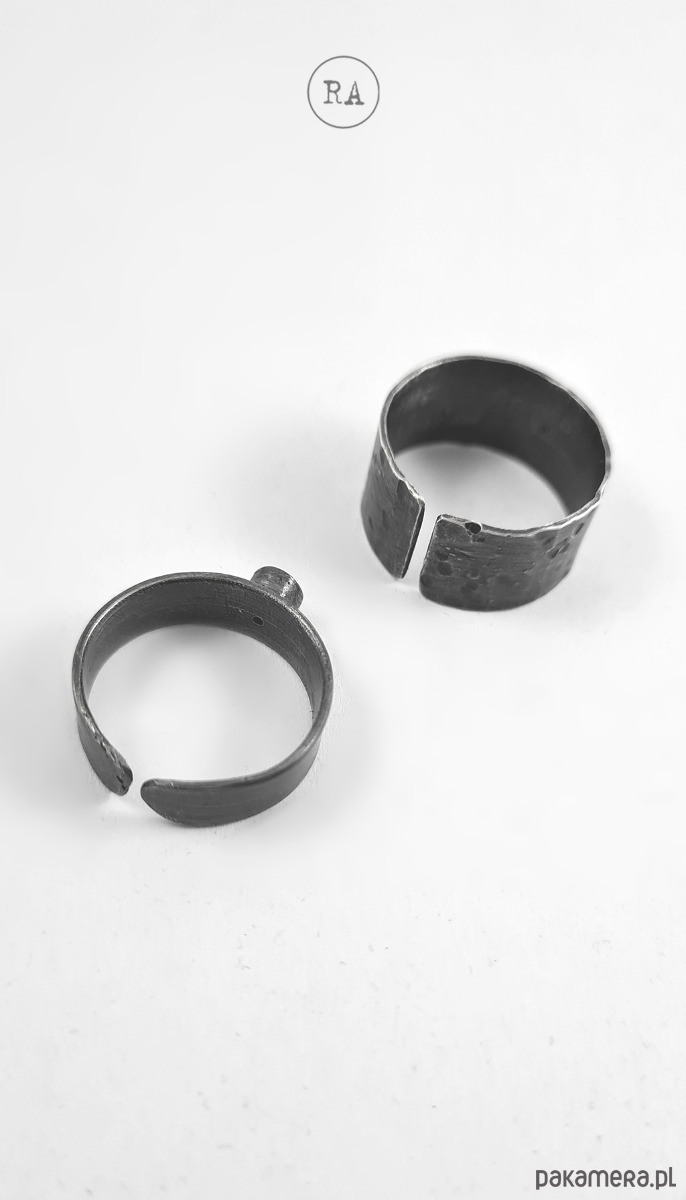 Pierścionek regulowany, wykonany ze srebra, o szerokości ok. 6-7 mm.