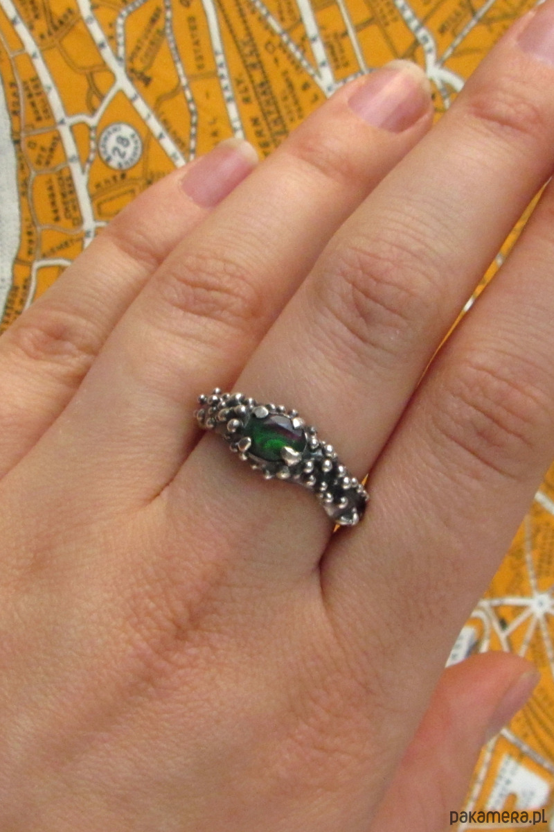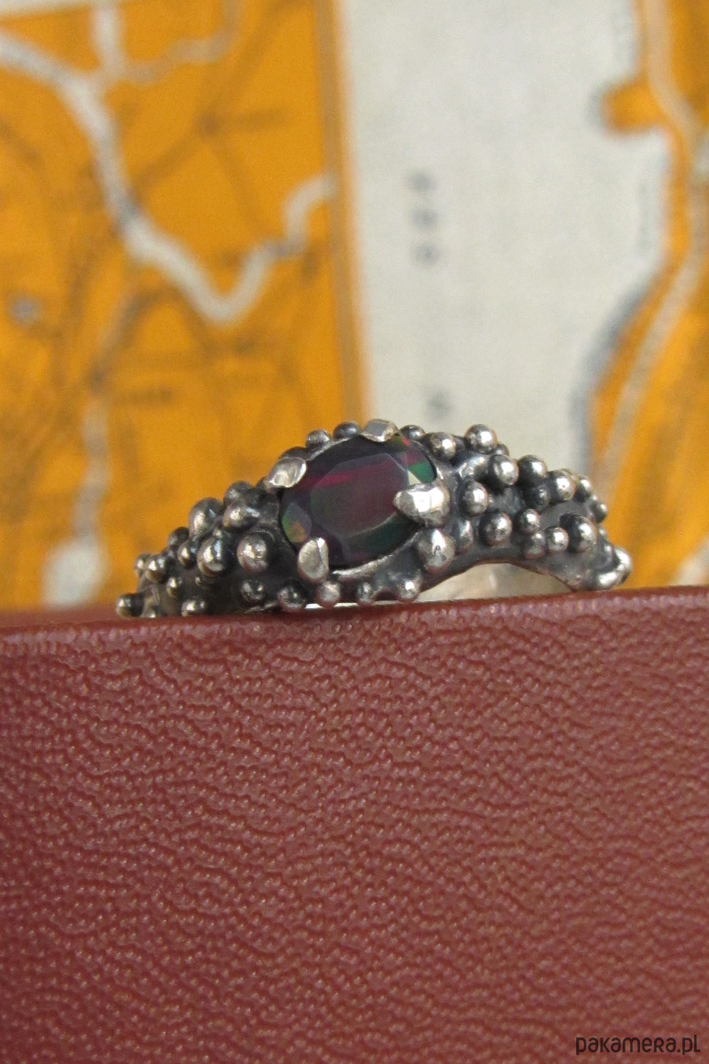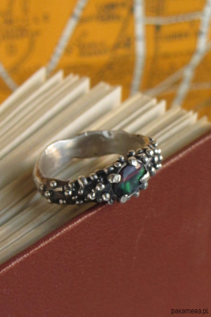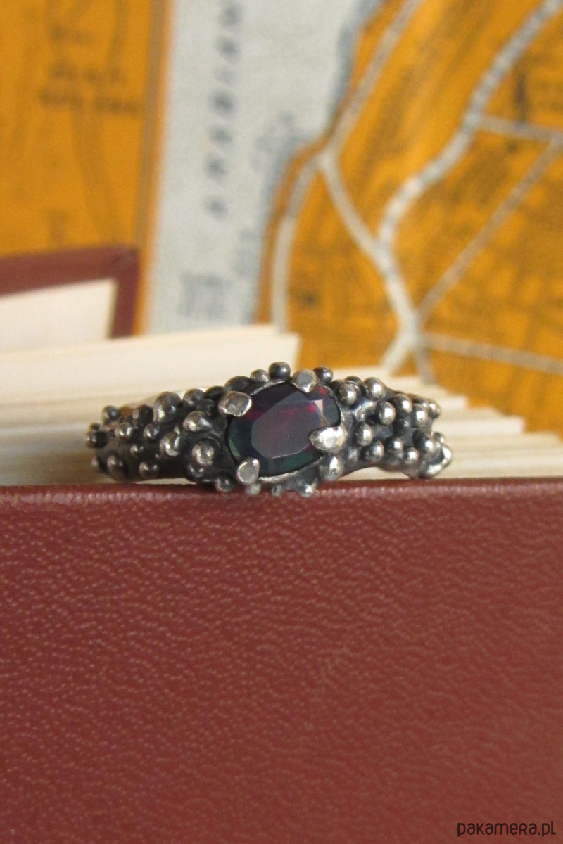 Unikalny pierścionek inspirowany Smoczym Okiem. W jego centrum znajduje się czarny opal, mieniący się na zieleń, czerwień i pomarańcz. Pierścionek został w całości ręcznie wyrzeźbiony i jest unikatem.