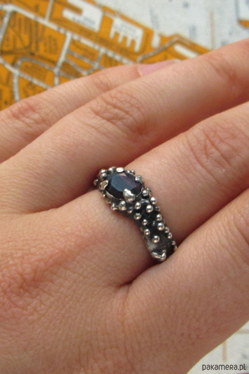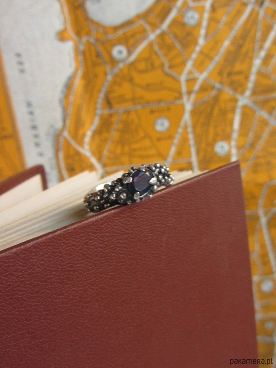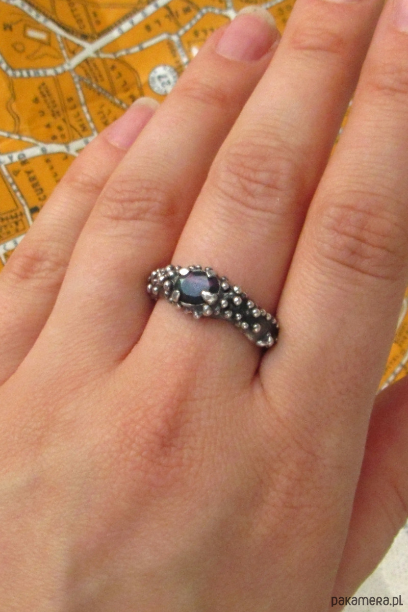 Unikalny pierścionek inspirowany Smoczym Okiem. W jego centrum znajduje się czarny opal, mieniący się na zieleń, czerwień i pomarańcz. Pierścionek został w całości ręcznie wyrzeźbiony i jest unikatem.
