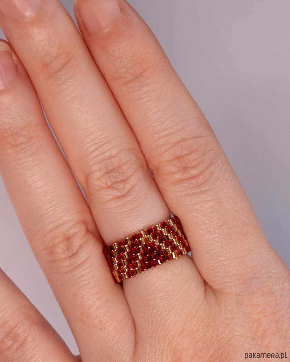 Pierścionek tkany ręcznie metodą peyote ze szklanych japońskich koralików Miyuki.